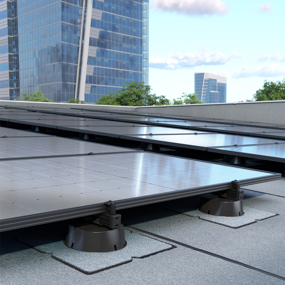 Our Basic system for flat roofs is highly resilient and quick to install. It is notable for its integrated cable routing system and simultaneous ballasting. The system is infinitely variable thanks to a flexible ridge gap.