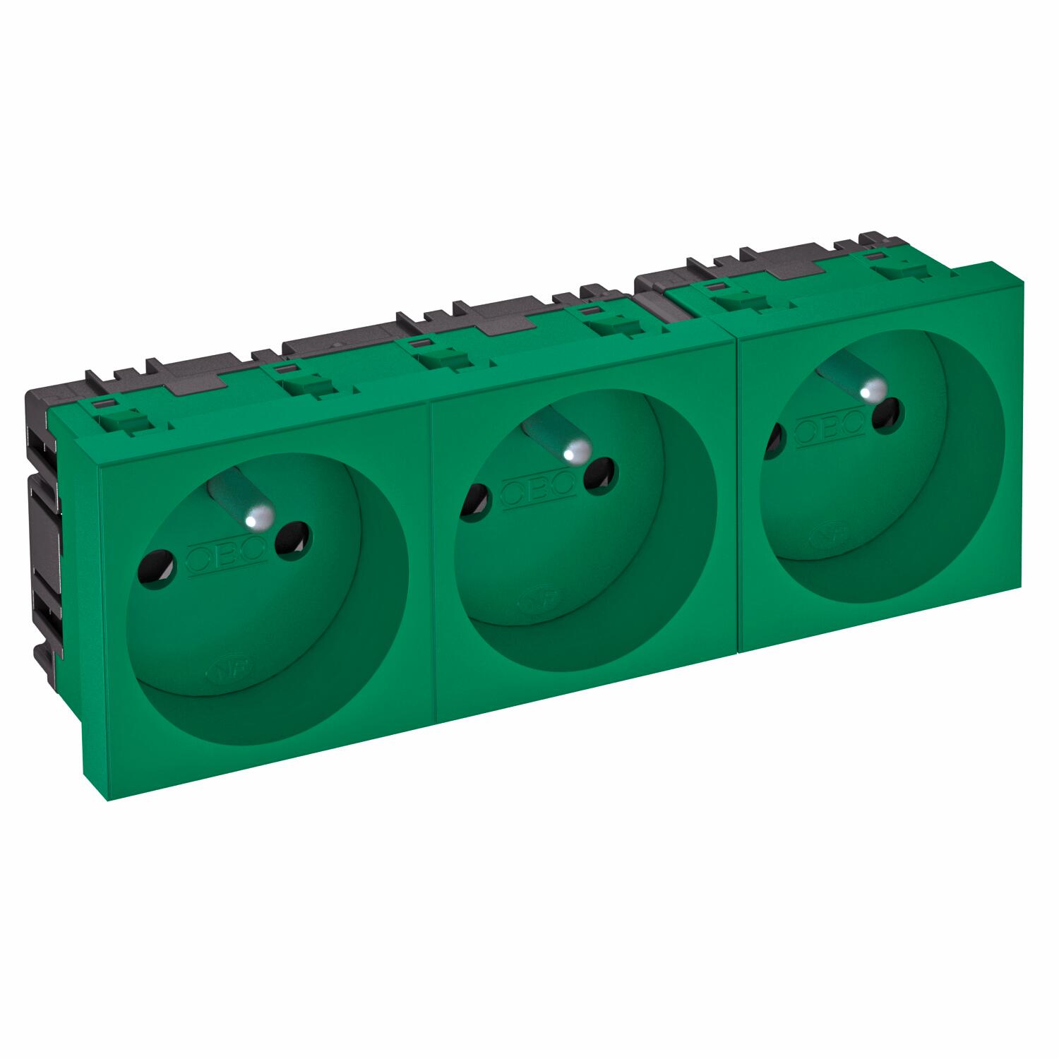 Product descriptionSocket with earthing pin, triple 0°, with increased touch protection, with screwless terminals, 2-pin, 16 A, 250 V~, with connection terminals to IEC 60884-1.