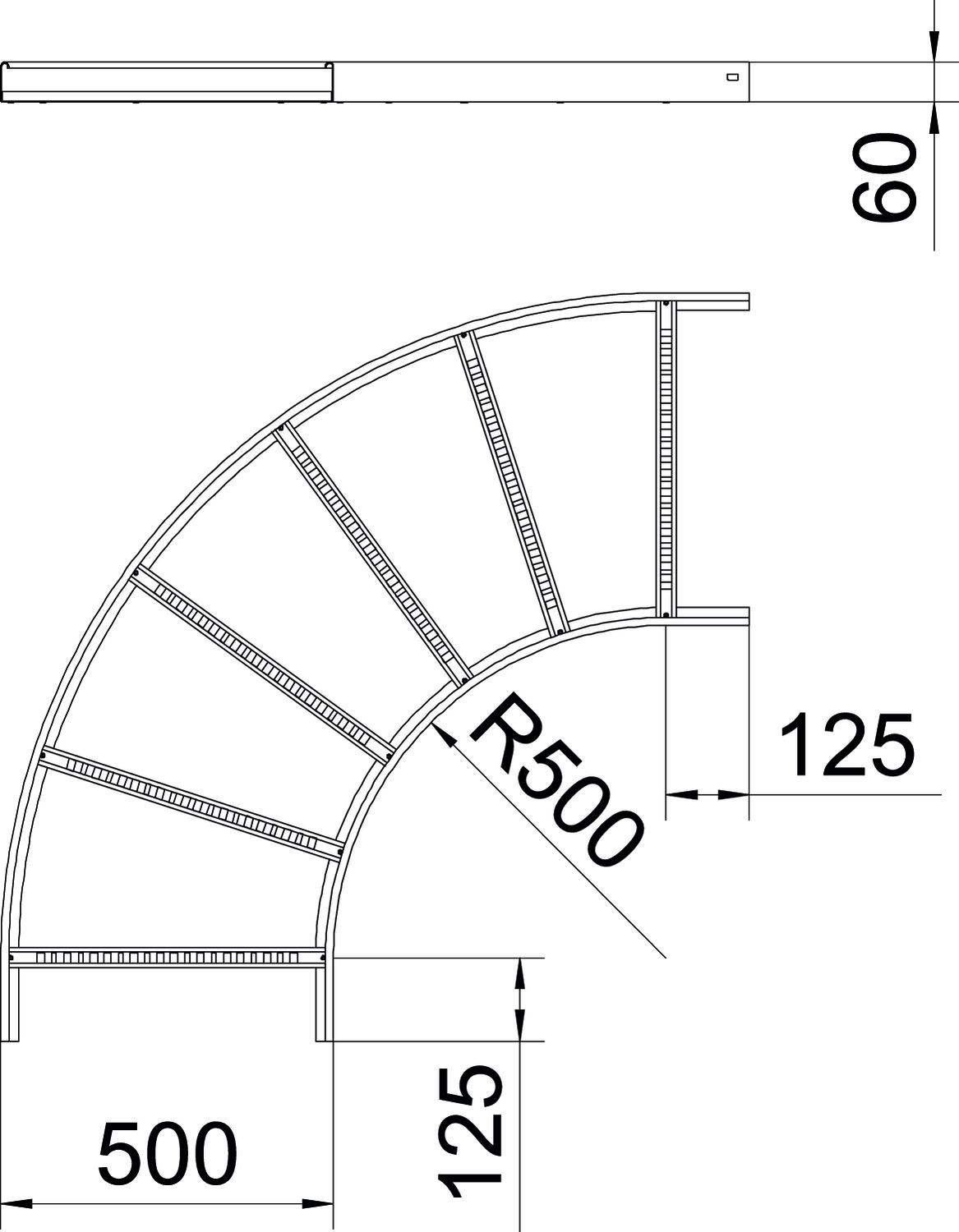 Bend (angle) 90° Change of direction Horizontal CO2 Footprint (GWP) Cradle-to-Gate 13,1565 kg CO2e / 1 Piece Colour zinc Connector version Without connectors Dimension 60x500 Dimension B 500 mm Dimension R 500 mm Height 60 mm Hinged no Maintain electrical functions no Material Steel Rail thickness 1,5 mm Rustproof steel, pickled no Side perforation no Side rail version Flat profile Surface Hot-dip galvanised Version of the rungs Profile unperforated Wide-span version no Width 500 mm - All types