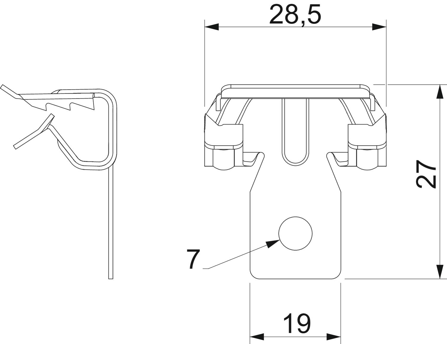 Breaking load 0,45 kN Connection type/component Hole Dimension 2-4mm Dimension B 28,5 mm Dimension E 7 mm Dimension L 27 mm Fastening hole 6,5 mm Fastening type Clamp Flange thickness F max. 4 mm Flange thickness F min. 2 mm Hinge, adjustable no Hinged no Material Steel Surface Zinc slat - All types