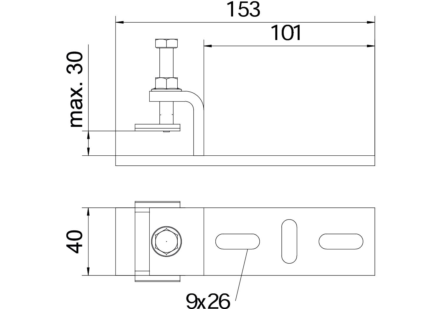 Adjustable yes CO2 Footprint (GWP) Cradle-to-Gate 1,0676 kg CO2e / 1 Piece Colour zinc Dimension 153x40x44mm Dimension B 153 mm Dimension b 101 mm Dimension B1 101 mm Height 28 mm Maintain electrical functions no Material Steel Material thickness 6 mm Suitable for profile shapes C profile Surface Hot-dip galvanised Version for Miscellaneous Width 153 mm With screw accessories no - All types