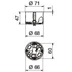 Airtight yes Cable entries 3 x 1.5 mm² 2 Cable entries 3 x 2.5 mm² / 5 x 1.5 mm² 2 CO2 Footprint (GWP) Cradle-to-Gate 0,0772 kg CO2e / 1 Piece Colour orange / grey Combination entries Ø 20 / 25 mm 2 Cover Without Cover fastening Screws , Device fixing Screws , Diameter 68 mm Dimension Ø68mm, H47mm Flame-resistant Acc. to VDE 0471/IEC 60695-2-11, test temperature 850°C for pipe diameter 20/25 mm Halogen-free yes Height 47 mm Impact-resistant no Material Polypropylen / Thermoplastisches Elastomer Milling hole diameter 68 mm No. of entries 6 Nominal cross-section, max. 2,5 mm² Nominal cross-section, min. 1,5 mm² Number of switch boxes 1 Protection rating IP30 Rated voltage 400 V Shape Round Sound insulation tested up to 70 dB according to ISO 10140-2 Suitable for plate thickness, max. 40 mm Suitable for plate thickness, min. 5 mm Support Connector Type of entry NYM cables, data cables and corrugated pipes Type of housing penetration Insertion membrane With bolts yes - All types
