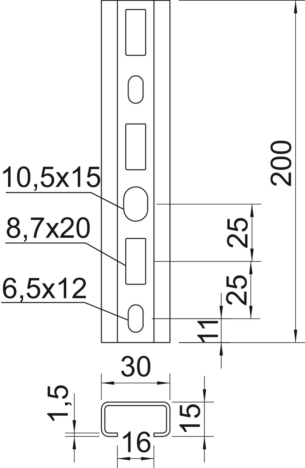 Breakable no CO2 Footprint (GWP) Cradle-to-Gate 0,3168 kg CO2e / 1 Piece Dimension 200x30x15 Dimension L 200 mm Drill hole spacing, centre 25 mm Height 15 mm Length 200 mm Maintain electrical functions no Material Steel Material thickness 1,5 mm Profile shape C profile Slot width 16 mm Static value A 0,8 cm² Static value ly 0,24 cm⁴ Static value lz 1,22 cm⁴ Static value Wy 0,29 cm³ Static value Wz 0,81 cm³ Surface Hot-dip galvanised Type of perforation Perforated back Version for Single profile Width 30 mm With perforation yes With toothing no - All types