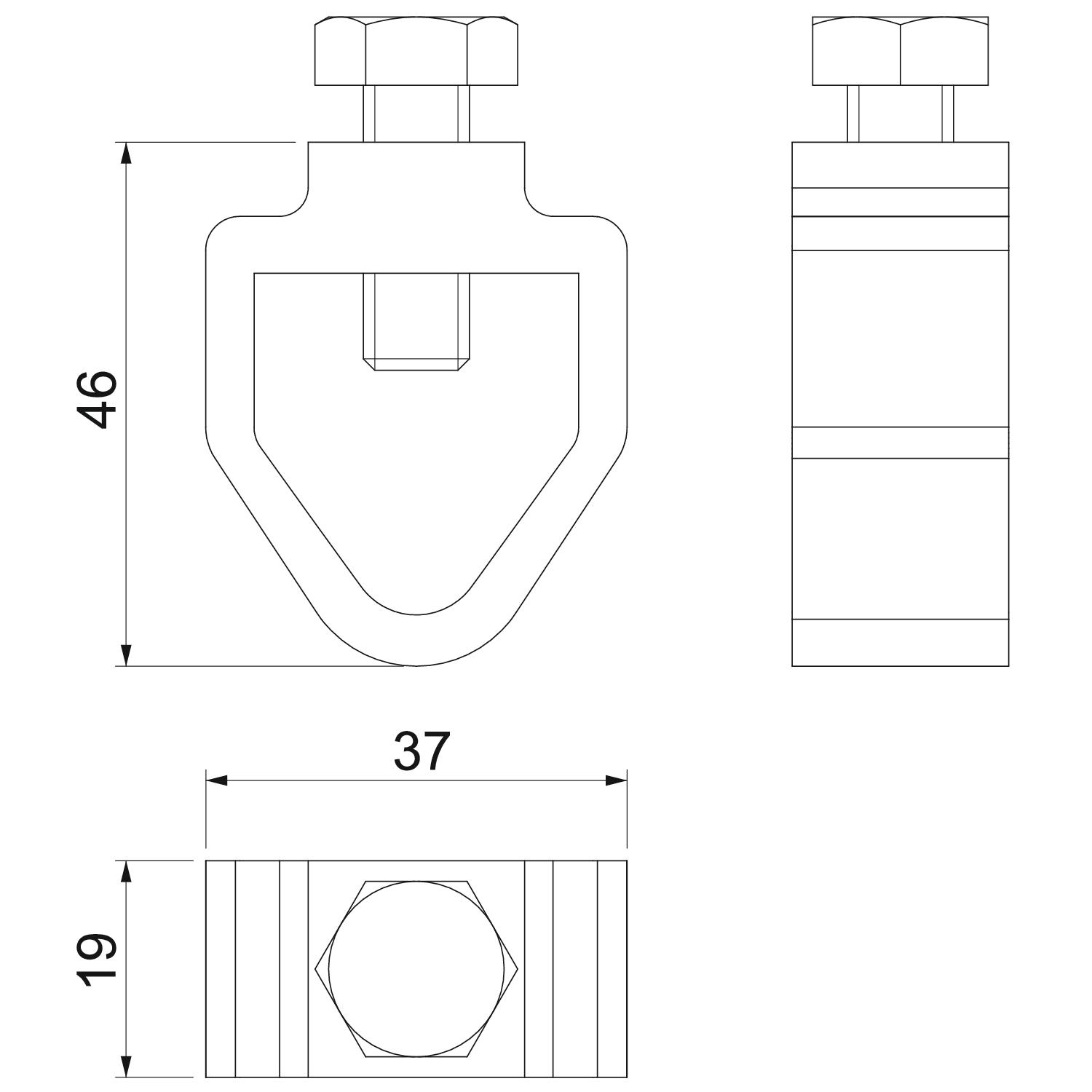 Connection Flat conductor Dimension 46x19x37 Fit Rd 14,2/ FL max. 26 x 12 mm Height 19 mm Intermediate plate no Length 46 mm Material Aluminium bronze Type Connection sleeve Type of connector Connectors Width 32 mm - All types