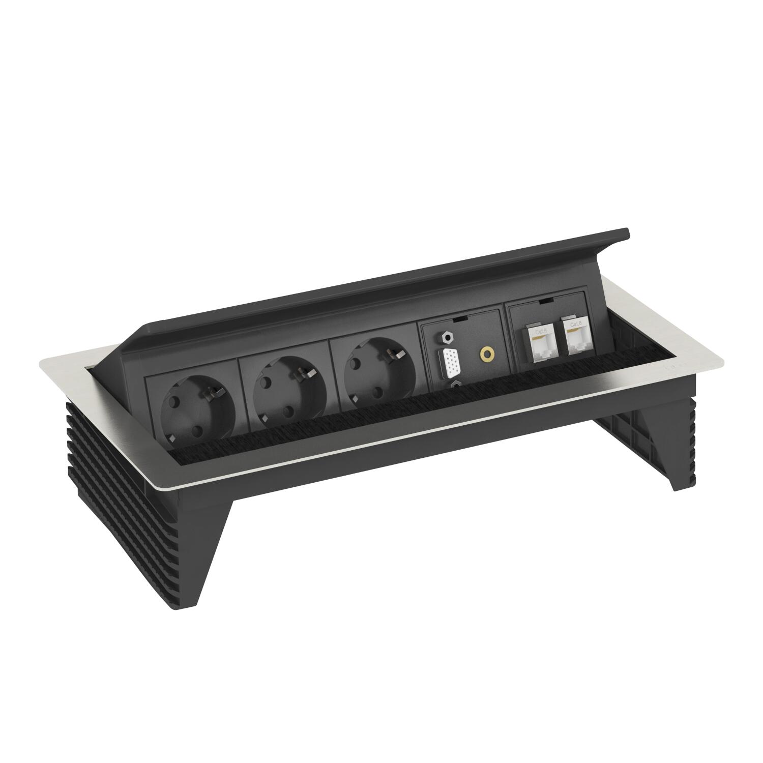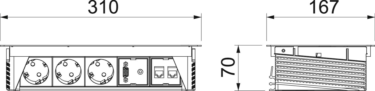 Dimension 310x167x68 Extendable no Foldable yes Installation depth 68 mm Length 310 mm Length of the supply cable 3 m Material Stainless steel 1.4301 Number of audio connections 1 Number of CAT 6 connections 2 Number of SCHUKO sockets 3 Number of VGA connections 1 Surge protection no - All types