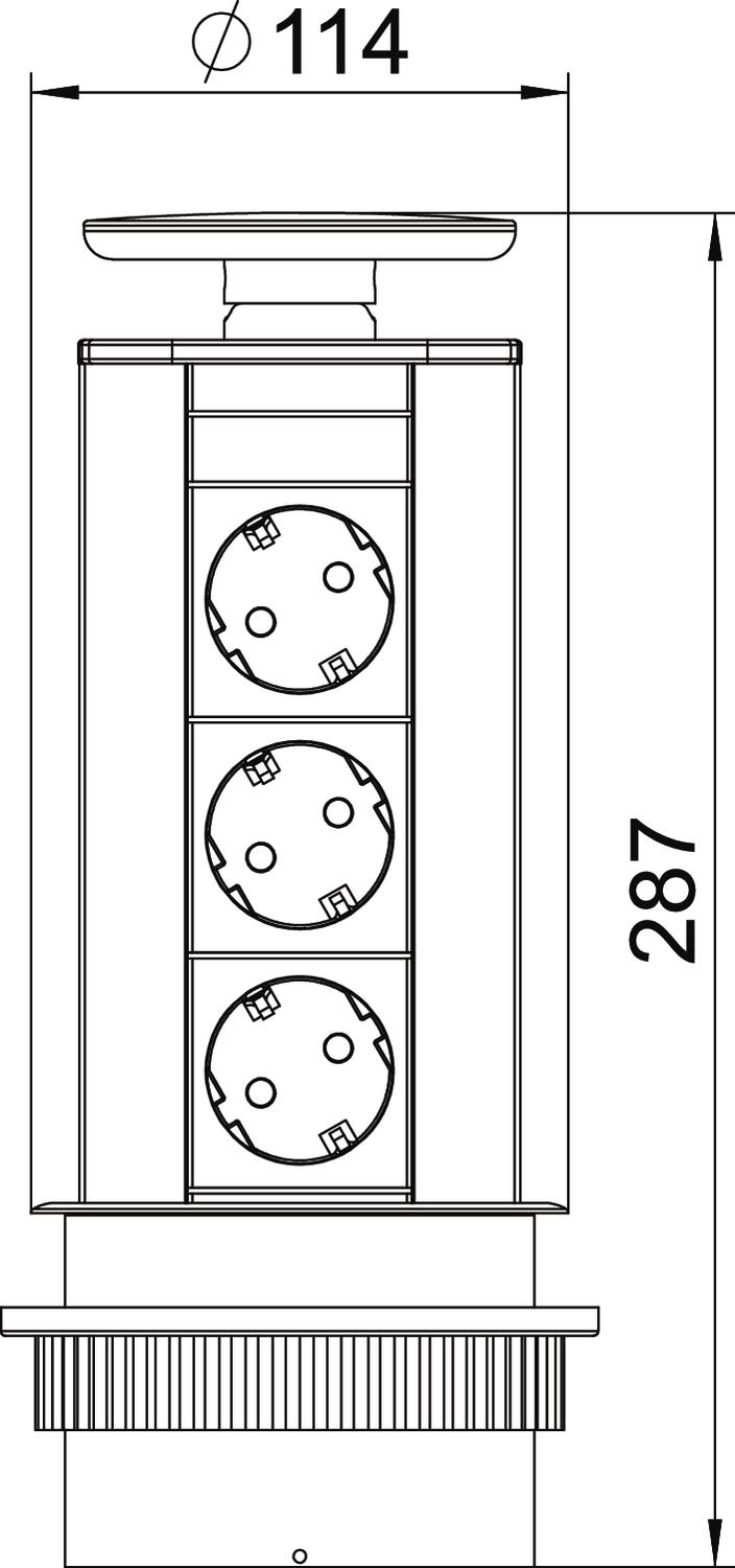 Colour aluminium Extendable yes External diameter 114 mm Foldable no Length 287 mm Length of the supply cable 3 m Material Aluminium Number of SCHUKO sockets 3 Surface Anodised Surge protection no Version for Lid, painted silver - All types