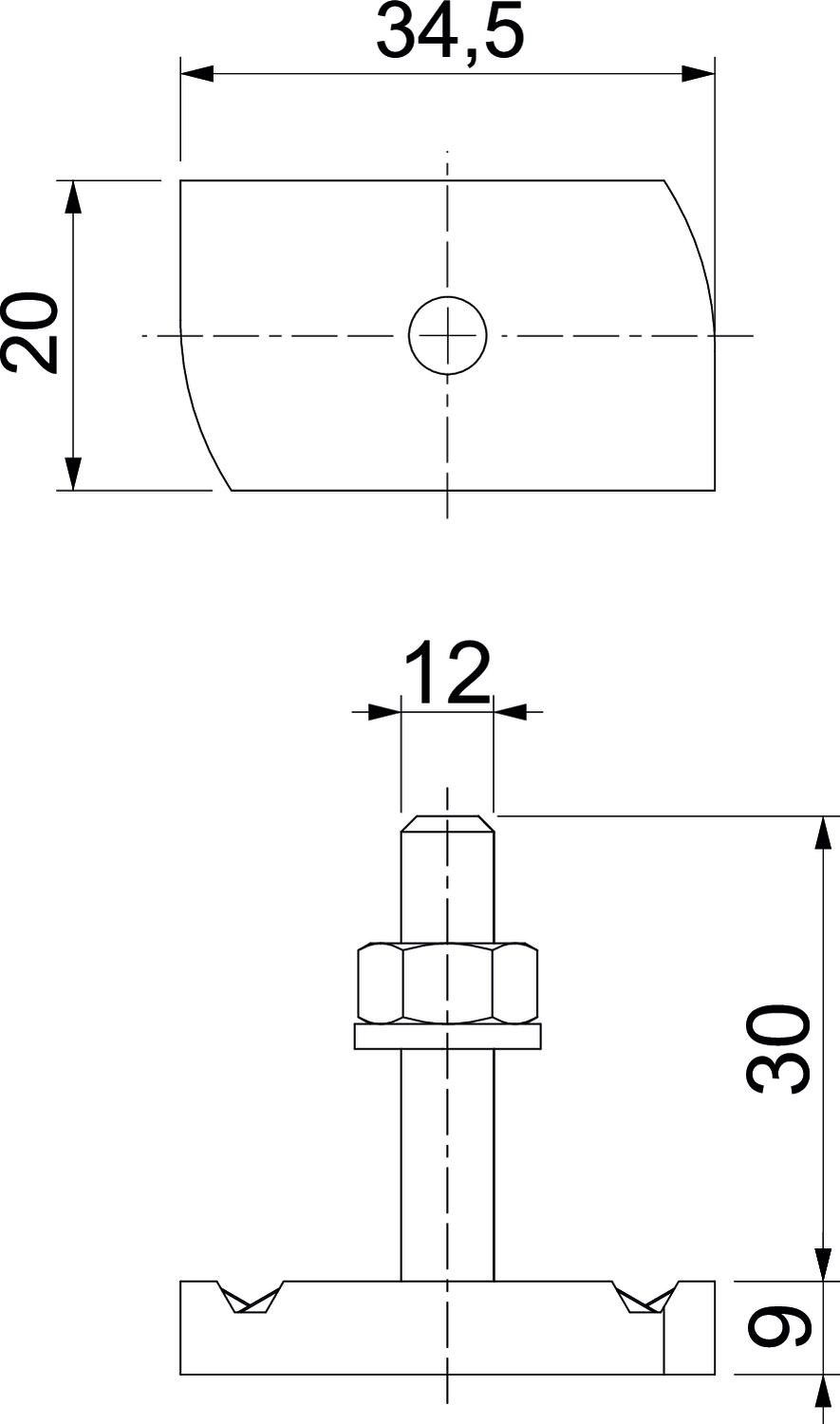 CO2 Footprint (GWP) Cradle-to-Gate 0,4361 kg CO2e / 1 Piece Dimension M12x30mm Dimension H 9 mm Dimension L 30 mm Height 9 mm Length 34,5 mm Material Stainless steel Suitable for mounting rail yes Surface Bright, treated Thread M 12 x 30 Torque 14,4 Nm Washer Ø 24 mm Width 20 mm - All types