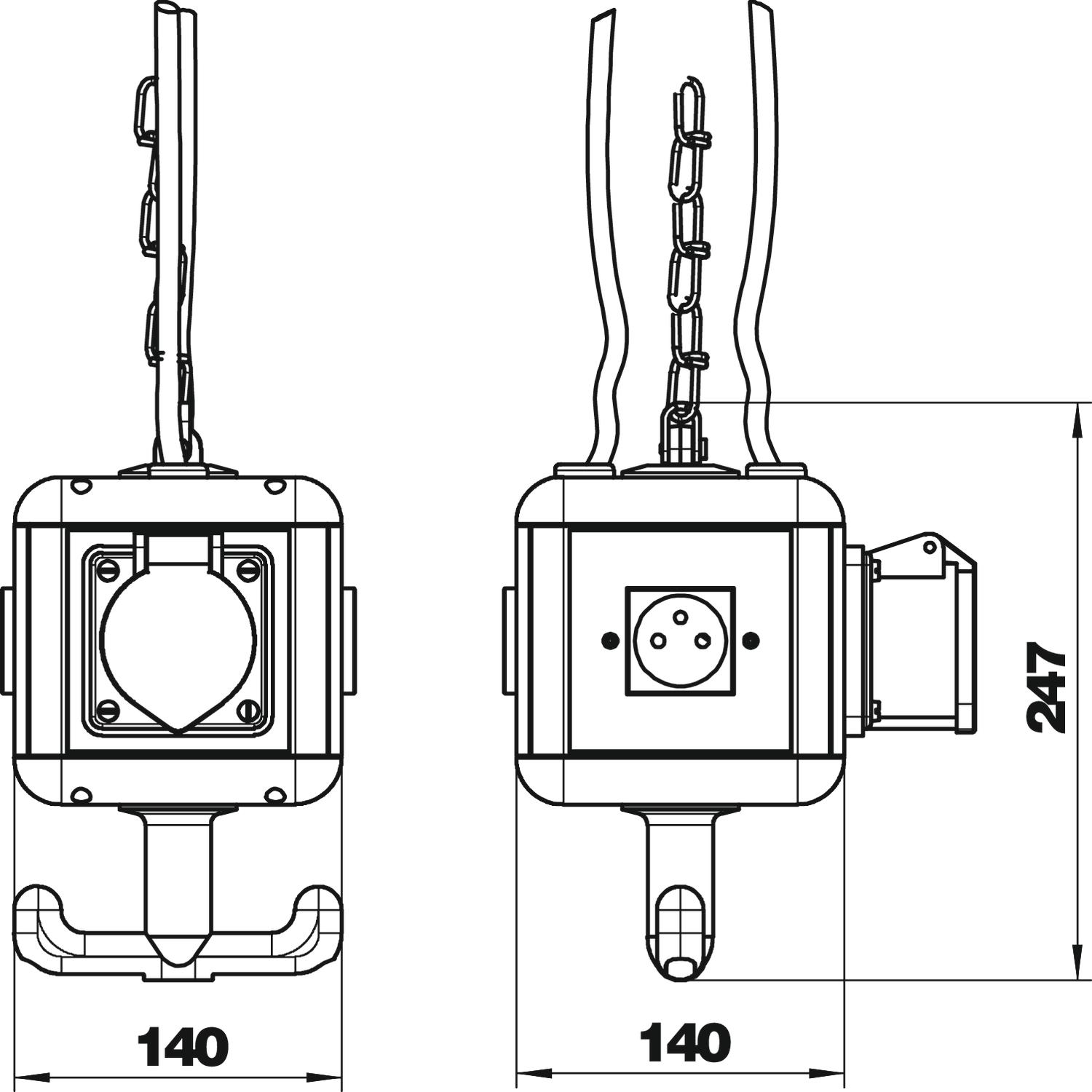 Equipped as follows: 3x single sockets with earthing pin 16 A/250 V with increased touch protection, pre-wired for an AC current, connection via 1x 3-pin terminal, 1x CEE socket