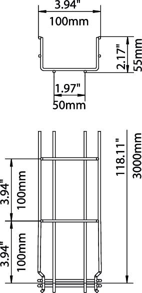 CO2 Footprint (GWP) Cradle-to-Gate 3,64 kg CO2e / 1 Meter Colour stainless steel Connector version Integrated connector Dimension 55x100x3000 Dimension B 100 mm Dimension H 58 mm Fire protection Maintenance of electrical function of cable-specific support structure Height 2,17 in Height 55 mm Integrated partition Without Length 3000 mm Load test type according to IEC 61537 Type II Maintain electrical functions yes Material Stainless steel 1.4301 Profile shape U-shaped Rustproof steel, pickled yes Screwless connector yes Support spacing 1.0 m 0,35 kN/m Support spacing 1.5 m 0,2 kN/m Support spacing 2.0 m 0,1 kN/m Support spacing 2.5 m 0,1 kN/m Surface Bright, treated Type of connector, cable support system Click fastening Usable cross-section 40 cm² Usable cross-section 4000 mm² Width 3,94 in Width 100 mm Wire diameter 3,9 mm Technical data