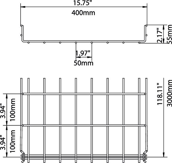 No additional connection components are required for the mesh cable tray, it is simply interlocked. The grid width is 50 x 100 mm (exception: GRM 55/50 = 20 x 100 mm).