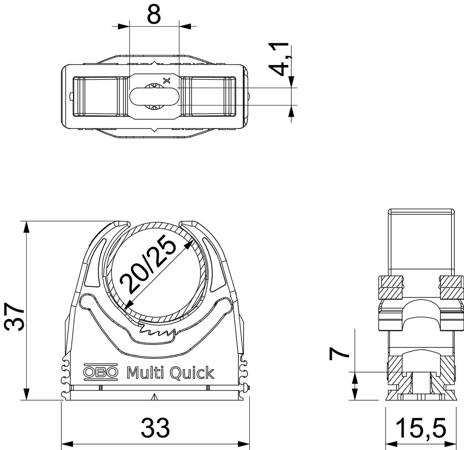 Product descriptionFlush-mounted clip to accept metric pipes and Quick-Pipe® electrical installation pipes. Flexible clamping range of several millimetres. Universal fastening options on walls and ceilings, both indoors and outdoors. Toolless pipe mounting. Can also be arranged with OBO Quick or proQuick clip.