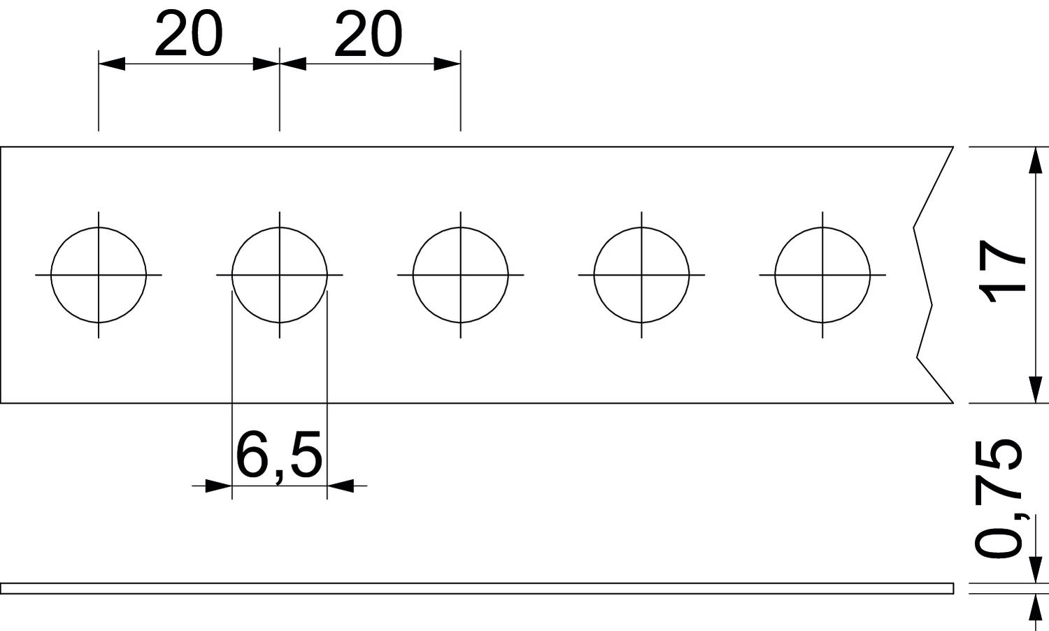 Dimension 17x0,75mm Dimension 17 x 0,75 Dimension A 20 mm Dimension b 17 mm Dimension d 6,5 mm Hole diameter 6,5 mm In the holder yes Material Steel per rolls 50 Perforation Round/rectangular Size II Surface Strip galvanized Type of band Straight Version for Perforated With perforation yes - All types