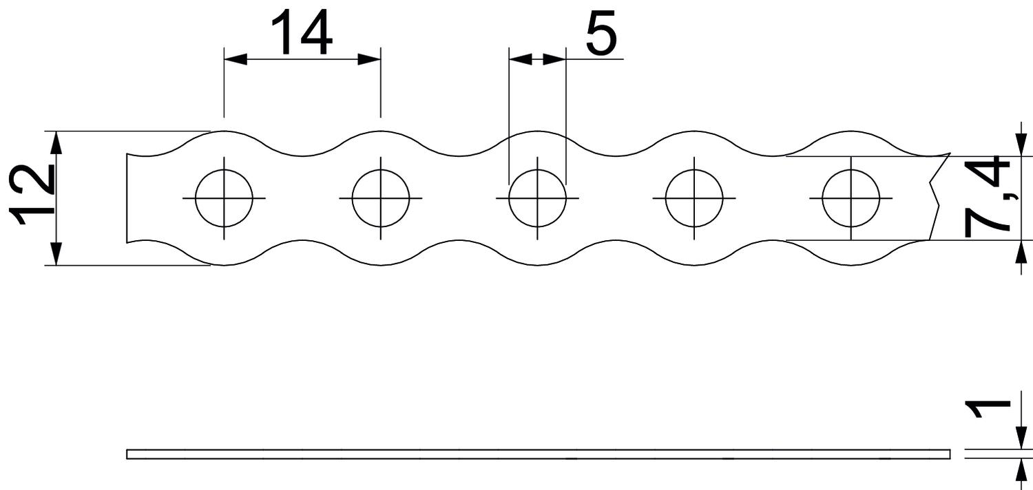 Dimension 12x1mm Dimension 12 x 1 Dimension A 14 mm Dimension b 12 mm Dimension b1 7,4 mm Dimension d 5 mm Hole diameter 5 mm In the holder yes Material Steel per rolls 10 Perforation Round Size I Surface Strip galvanized Type of band Ribbed Version for Perforated With perforation yes - All types