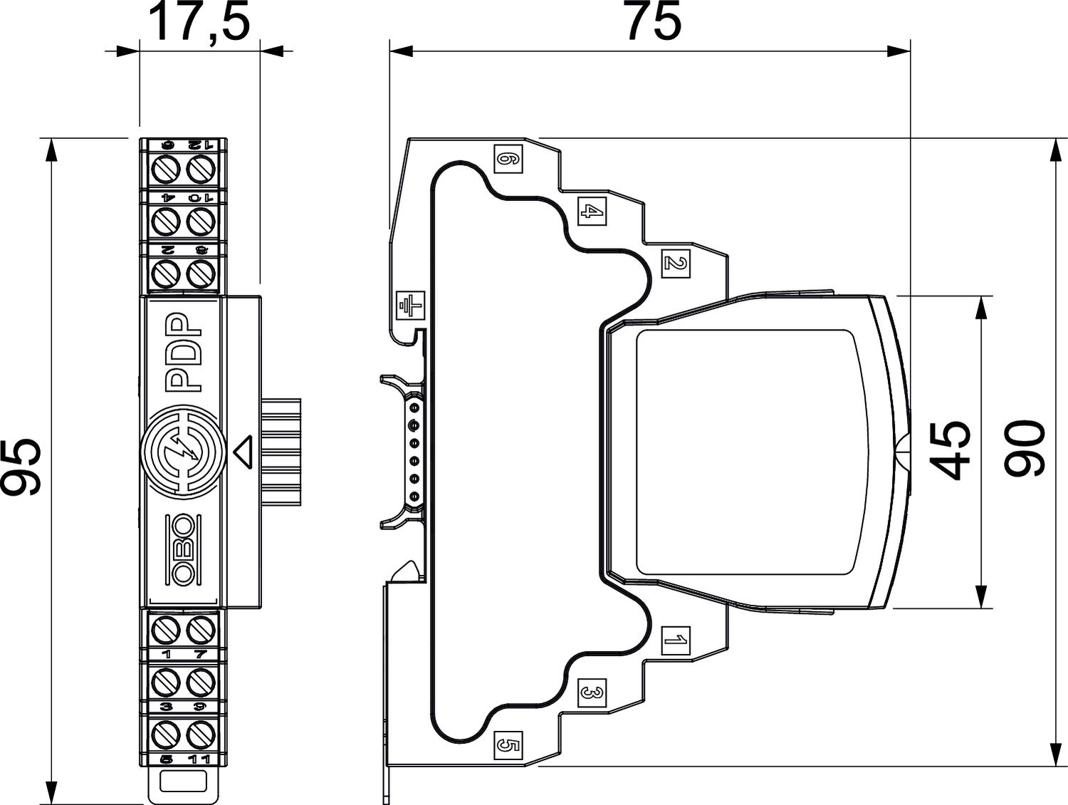 Capacity (wire-earth) ≤30 pF Capacity (wire-wire) ≤30 pF CO2 Footprint (GWP) Cradle-to-Gate 0,7889 kg CO2e / 1 Piece Connection cross-section, flexible, max. 1,5 mm² Connection cross-section, flexible, min. 0,14 mm² Connection cross-section, multi-wire, max. 2,5 mm² Connection cross-section, multi-wire, min. 0,14 mm² Connection cross-section, rigid, max. 2,5 mm² Connection cross-section, rigid, min. 0,14 mm² Cut-off frequency 100 MHz Dimension 48V Earthing via: Connection cable / DIN rail Height 95 mm Impulse durability wire-earth 10 kV / 5 kA Impulse durability wire-wire 10 kV / 5 kA Insertion loss ≤3 dB Kategorie Type 1+2 / D1+C2 Length 75 mm Lengthwise resistance 1.2 ± 5% Lightning impulse current 2,5 kA Lightning protection zone LPZ 0→2 Maximum continuous voltage AC 37 V Maximum continuous voltage DC 52 V Mounting of input / output Screw terminals Nominal discharge current (8/20 µs) 10 kA Nominal load current AC 0,425 A Nominal load current DC 0,6 A Number of poles 4 Permitted temperature range, max. 80 °C Permitted temperature range, min. -40 °C Plug-in system Terminal Protection level wire-earth 1600 V Protection level wire-wire 170 V Protection level, shield-earth (S-PE) 1300 V Protection rating IP20 Screening Indirect Series resistance per wire 1,2 Ω ± 5% Shielding connection available yes Signalling on device None SPD to EN 61643-11 Type 1+2 SPD to IEC 61643-1 Class I+II SPD to IEC 61643-21 Class I+II / D1+C2 Testing standard IEC 61643-21 Total discharge current (10/350) 2,5 kA Total discharge current (8/20) 20 kA Total impulse durability into C2 (8/20) 20 kA Version for 2x2-pole Width 17,5 mm - All types