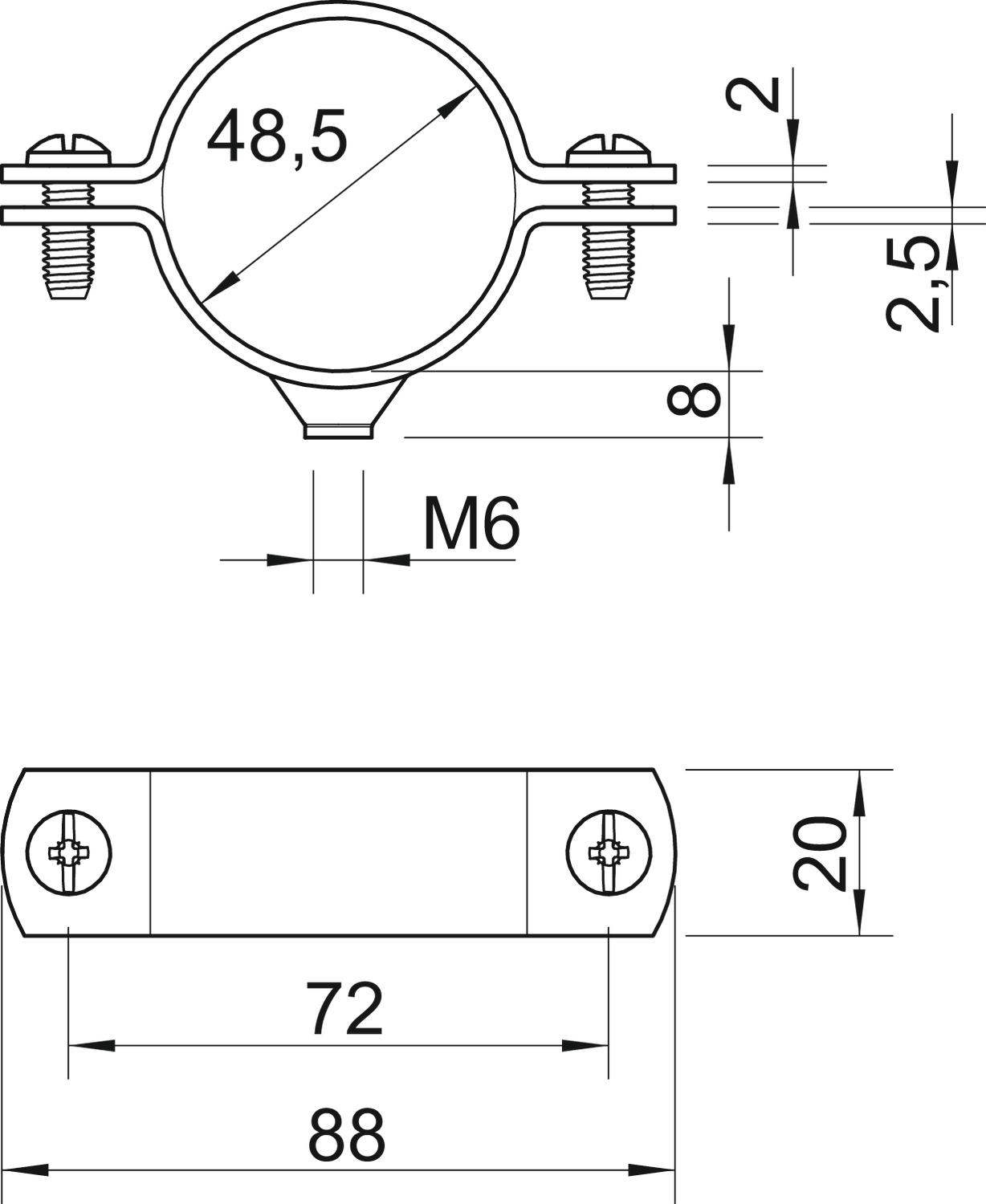Bolt M6 x 18 Clamping range D, max. 48,5 mm Clamping range D, min. 45,5 mm CO2 Footprint (GWP) Cradle-to-Gate 0,2043 kg CO2e / 1 Piece Dimension 1 1/2" Dimension A 88 mm Dimension B 72 mm Dimension D 48,5 mm Dimension d min. 48,5 mm Dimension t 2,5 mm Dimension t1 (mm) 2 Dimension x 3 mm Fastening type Screw hole For diameter 48,5 for pipe diameter M50 Halogen-free no Hole size M6 Length 88 mm Material Steel Material thickness 2,5 mm Plastic-covered no Size 1 1/2" Suitable in fire protection area no Surface Hot-dip galvanised Thread M6 UV-resistant yes Version for Closed Width 20 mm - All types