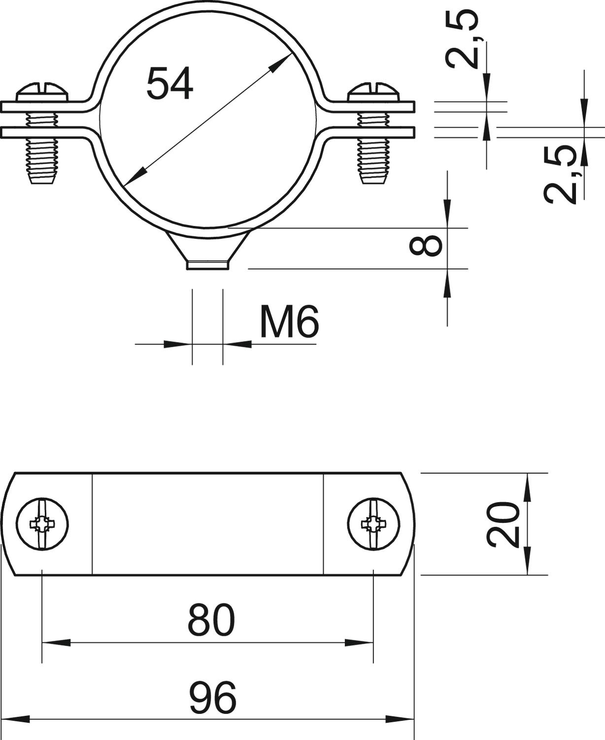 Bolt M6 x 18 Clamping range D, max. 54 mm Clamping range D, min. 51 mm CO2 Footprint (GWP) Cradle-to-Gate 0,2375 kg CO2e / 1 Piece Dimension 1 3/4" Dimension A 96 mm Dimension B 80 mm Dimension D 54 mm Dimension d min. 54 mm Dimension t 2,5 mm Dimension t1 (mm) 2,5 Dimension x 3 mm Fastening type Screw hole For diameter 54 Halogen-free no Hole size M6 Length 96 mm Material Steel Material thickness 2,5 mm Plastic-covered no Size 1 3/4" Suitable in fire protection area no Surface Hot-dip galvanised Thread M6 UV-resistant yes Version for Closed Width 20 mm - All types