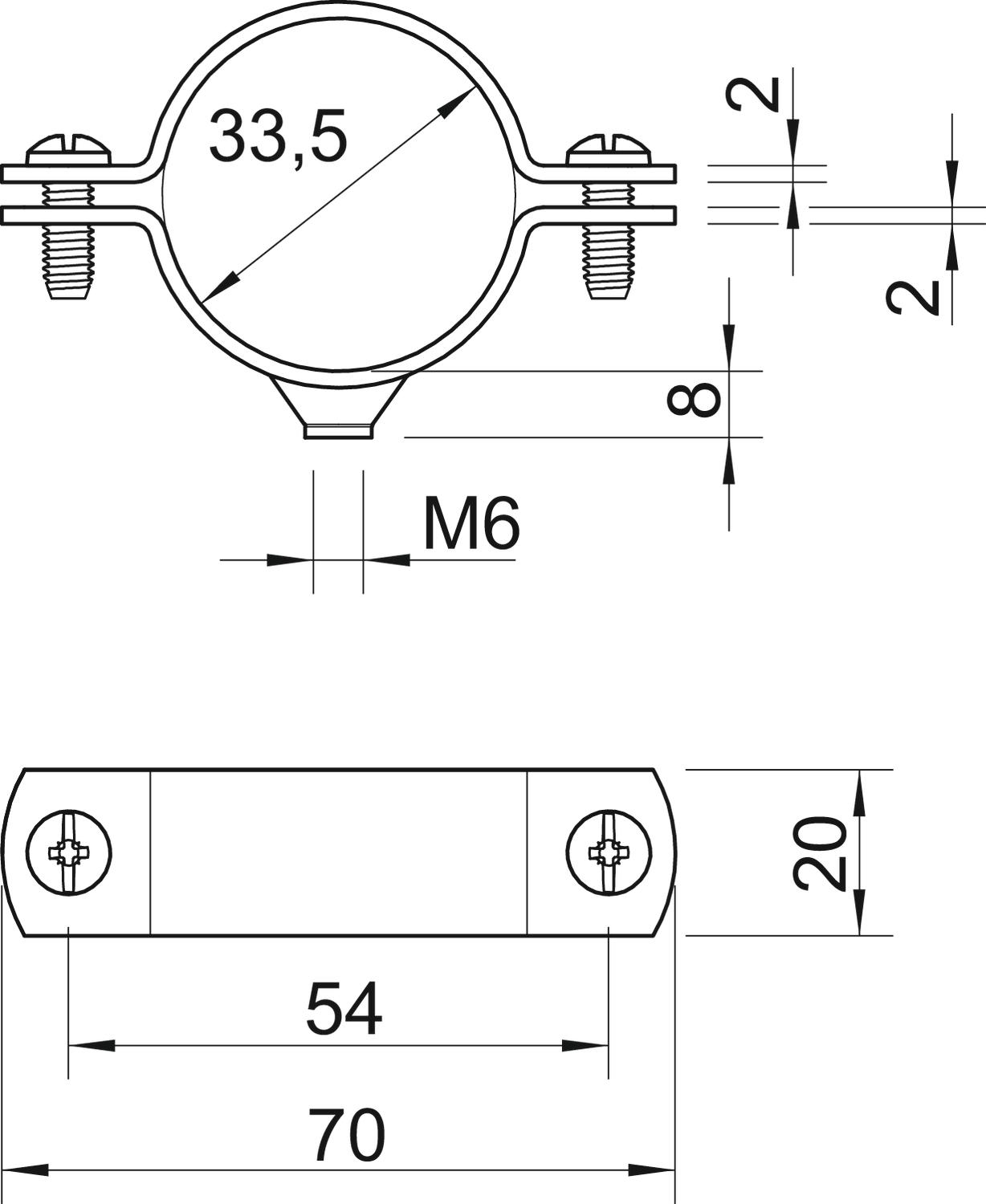 Bolt M6 x 16 Clamping range D, max. 33,5 mm Clamping range D, min. 30,5 mm CO2 Footprint (GWP) Cradle-to-Gate 0,1441 kg CO2e / 1 Piece Dimension 1" Dimension A 70 mm Dimension B 54 mm Dimension D 33,5 mm Dimension d min. 33,5 mm Dimension t 2 mm Dimension t1 (mm) 2 Dimension x 3 mm Fastening type Screw hole For diameter 33,5 for pipe diameter M32 Halogen-free no Hole size M6 Length 70 mm Material Steel Material thickness 2 mm Plastic-covered no Size 1" Suitable in fire protection area no Surface Hot-dip galvanised Thread M6 UV-resistant yes Version for Closed Width 20 mm - All types