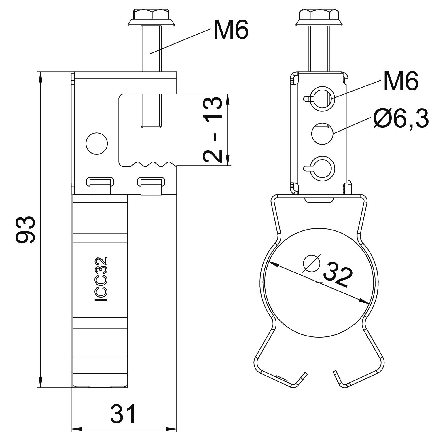 Breaking load 0,45 kN Colour zinc Connection type/component Pipe/cable Dimension 2-13mm Dimension H 93 mm Fastening type Bolts Flange thickness F max. 16 mm Flange thickness F min. 2 mm Height 93 mm Hinge, adjustable no Hinged no Length 31 mm Material Steel Pipe/cable diameter, max. 32 mm Pipe/cable diameter, min. 30 mm Surface Zinc slat Width 39 mm - All types