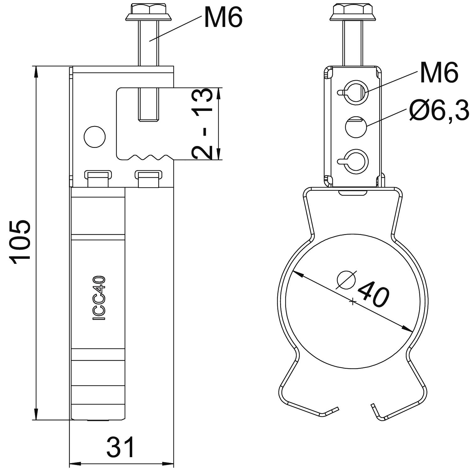 Breaking load 0,45 kN Colour zinc Connection type/component Pipe/cable Dimension 2-13mm Dimension H 105 mm Fastening type Clamp Flange thickness F max. 16 mm Flange thickness F min. 2 mm Height 105 mm Hinge, adjustable no Hinged yes Length 31 mm Material Steel Pipe/cable diameter, max. 40 mm Pipe/cable diameter, min. 36 mm Surface Zinc slat Width 44 mm - All types