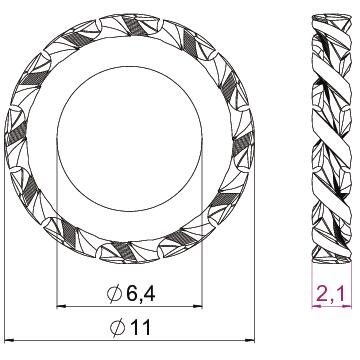 CO2 Footprint (GWP) Cradle-to-Gate 0,0013 kg CO2e / 1 Piece Dimension M6 Dimension d 6,4 mm Dimension d max. 11 mm Dimension d min. 11 mm Dimension h 2,1 mm External diameter 11 mm Height 2,1 mm Inner diameter 0,25 mm Lock washer version Open external gearing Material Steel Plate thickness 0,08 in Surface Electrogalvanized Thickness 2,1 mm Thread M6 - All types