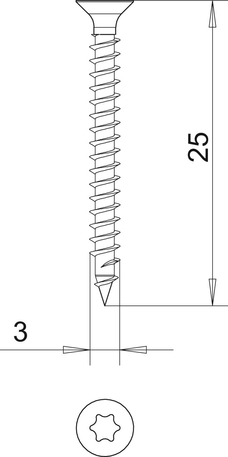 Dimension 3x25mm Dimension D 3 mm Dimension L 25 mm Hardened yes Head diameter 5,6 mm Head shape Countersunk head Length 25 mm Material Steel Screw system Torx Surface Electrogalvanized - All types