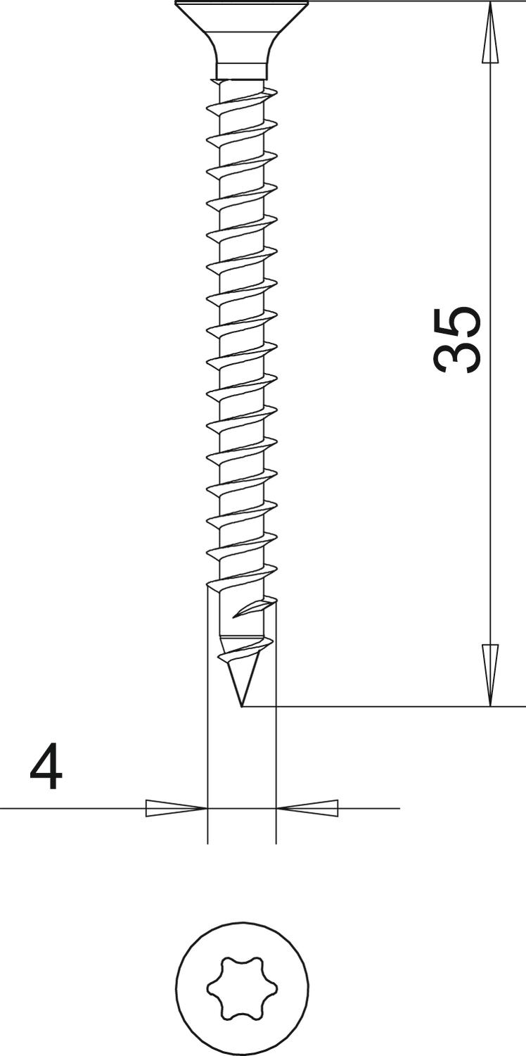 Dimension 4x35mm Dimension D 4 mm Dimension L 35 mm Hardened yes Head diameter 7,5 mm Head shape Countersunk head Length 35 mm Material Steel Screw system Torx Surface Electrogalvanized - All types