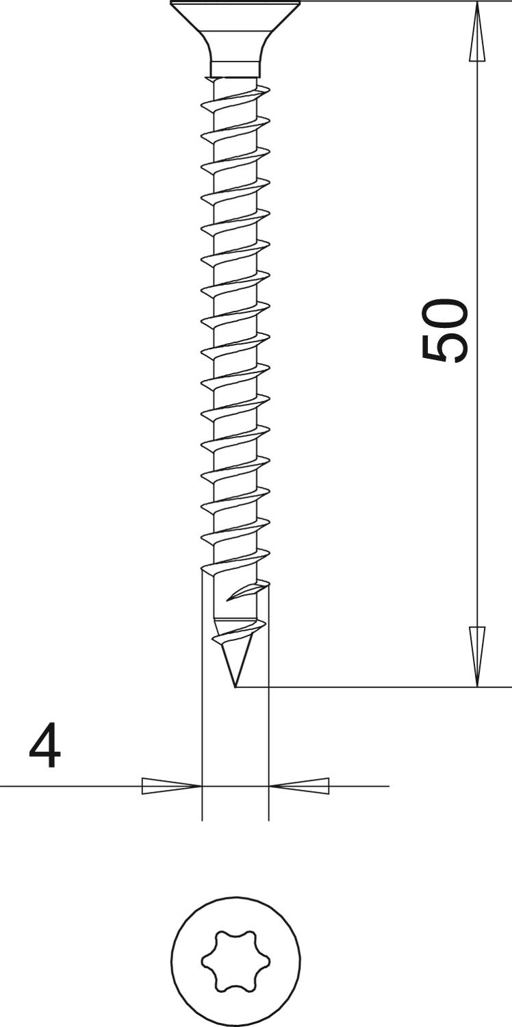 Dimension 4x50mm Dimension D 4 mm Dimension L 50 mm Hardened yes Head diameter 7,5 mm Head shape Countersunk head Length 50 mm Material Steel Screw system Torx Surface Electrogalvanized - All types