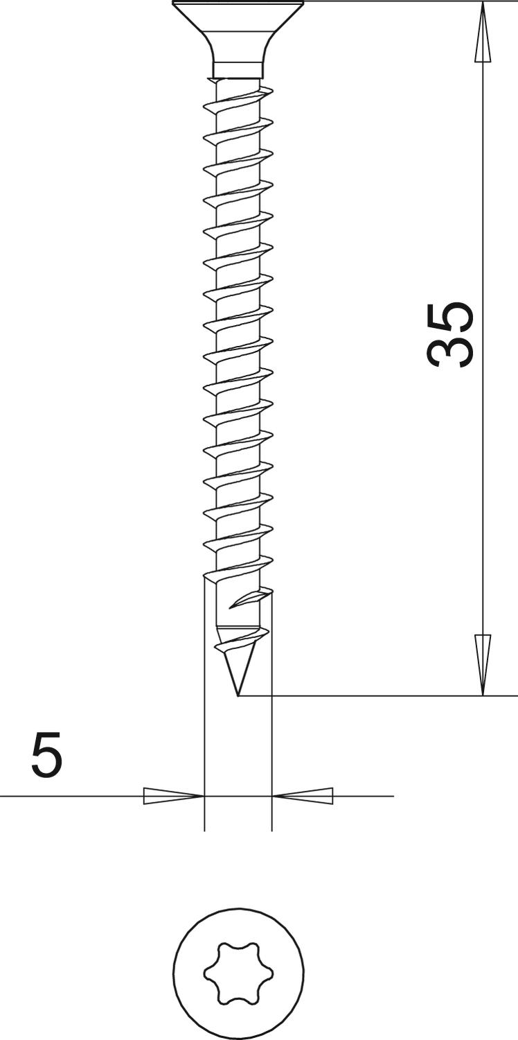 Dimension 5x35mm Dimension D 5 mm Dimension L 35 mm Hardened yes Head diameter 9,2 mm Head shape Countersunk head Length 35 mm Material Steel Screw system Torx Surface Electrogalvanized - All types