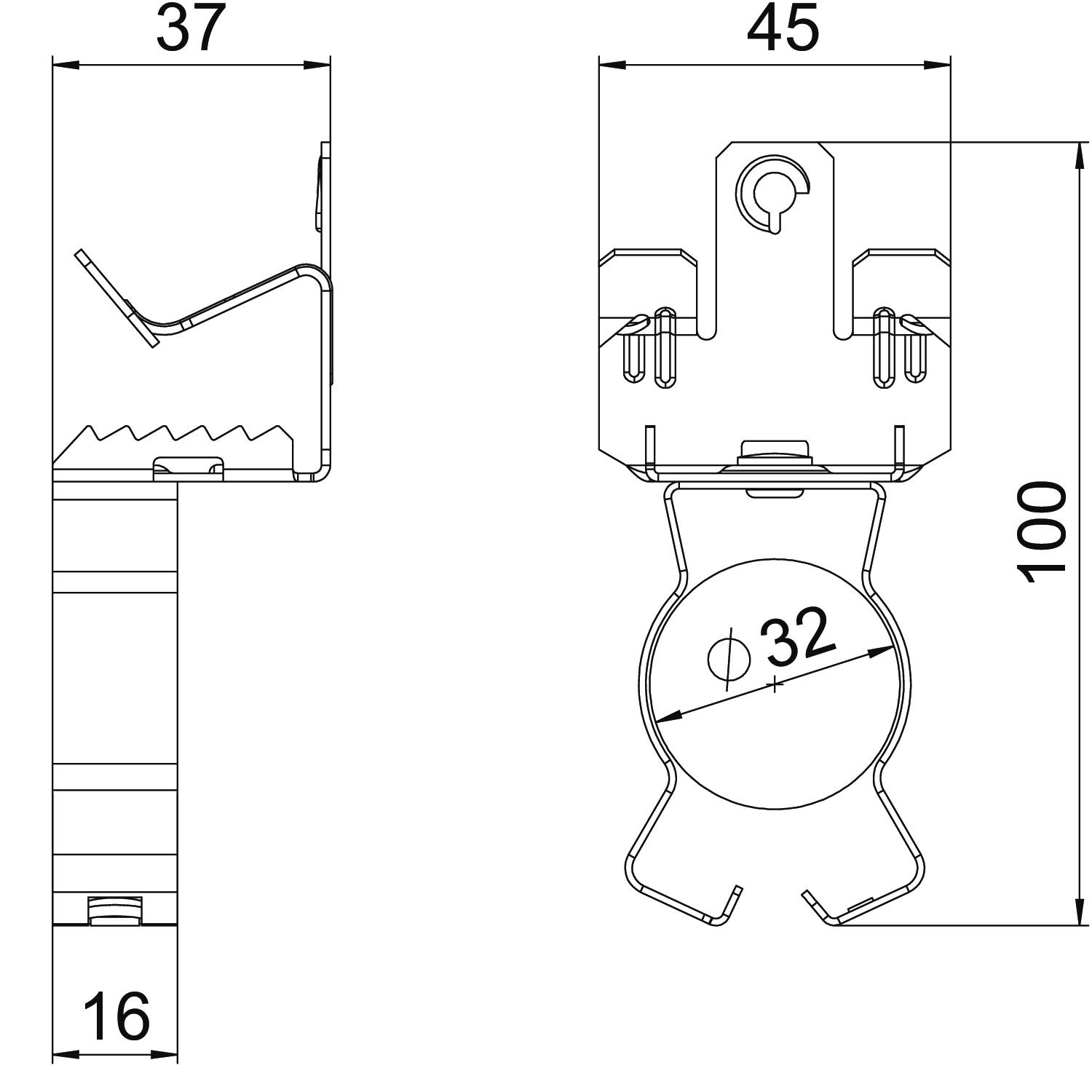 Breaking load 0,45 kN Colour zinc Connection type/component Pipe/cable Dimension 14-20mm Dimension L 100 mm Fastening type Clamp Flange thickness F max. 20 mm Flange thickness F min. 14 mm Height 36 mm Hinge, adjustable no Hinged no Length 100 mm Material Steel Pipe/cable diameter, max. 32 mm Pipe/cable diameter, min. 30 mm Surface Zinc slat Width 45 mm - All types