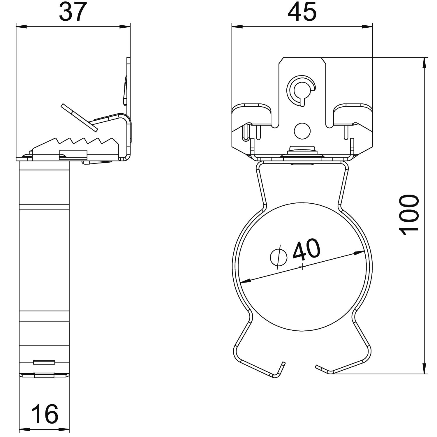 Breaking load 0,45 kN Colour zinc Connection type/component Pipe/cable Dimension 3-7mm Dimension L 100 mm Fastening type Clamp Flange thickness F max. 7 mm Flange thickness F min. 3 mm Height 37 mm Hinge, adjustable no Hinged no Length 103 mm Material Steel Pipe/cable diameter, max. 40 mm Pipe/cable diameter, min. 36 mm Surface Zinc slat Width 45 mm - All types