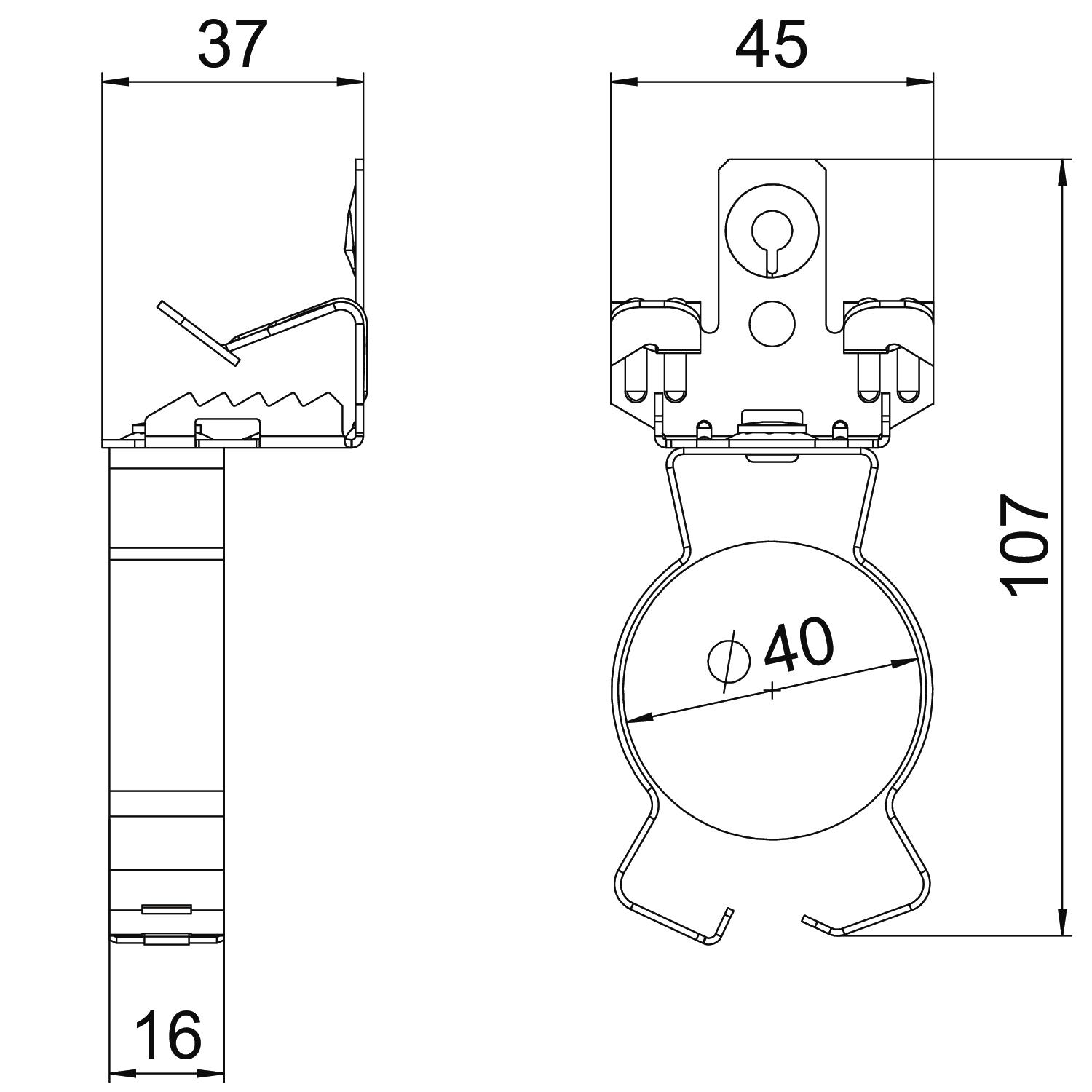Breaking load 0,45 kN Colour zinc Connection type/component Pipe/cable Dimension 7-13mm Dimension L 107 mm Fastening type Clamp Flange thickness F max. 13 mm Flange thickness F min. 7 mm Height 37 mm Hinge, adjustable no Hinged no Length 110 mm Material Steel Pipe/cable diameter, max. 40 mm Pipe/cable diameter, min. 36 mm Surface Zinc slat Width 45 mm - All types