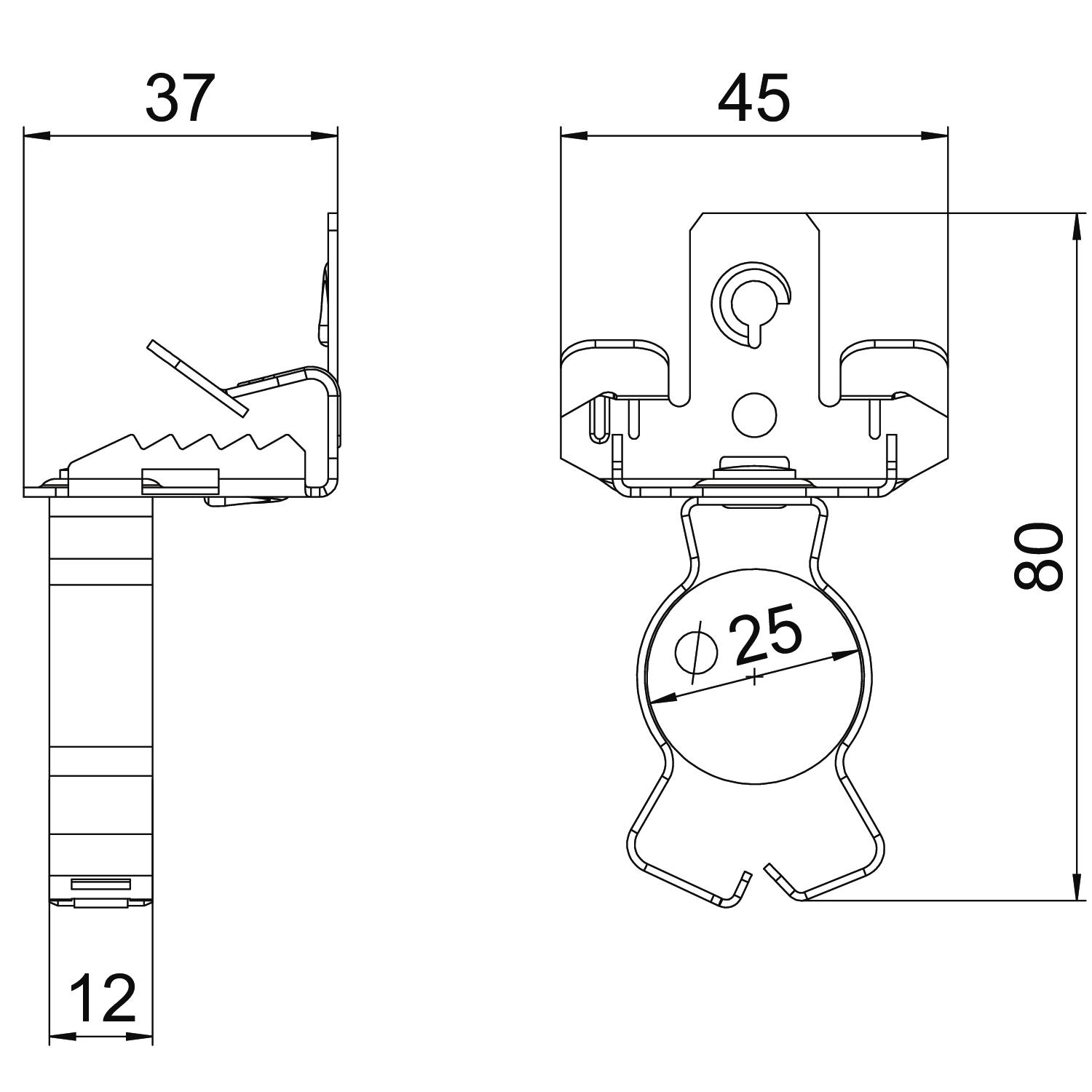 Breaking load 0,45 kN Colour zinc Connection type/component Pipe/cable Dimension 3-7mm Dimension L 80 mm Fastening type Clamp Flange thickness F max. 7 mm Flange thickness F min. 3 mm Height 37 mm Hinge, adjustable no Hinged no Length 81 mm Material Steel Pipe/cable diameter, max. 25 mm Pipe/cable diameter, min. 20 mm Surface Zinc slat Width 45 mm - All types