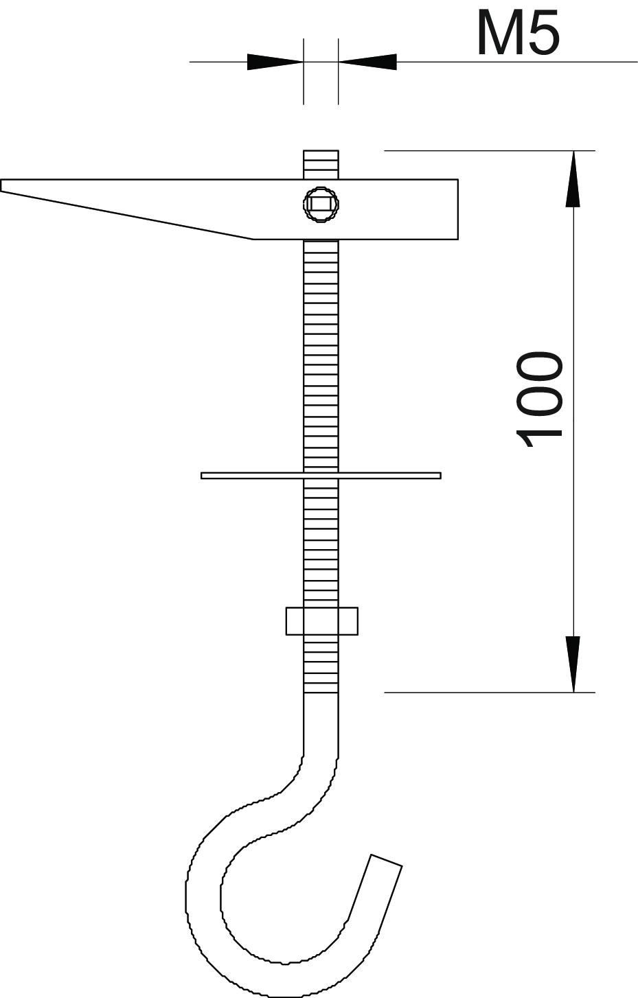 Breaking load 0,4 kN CO2 Footprint (GWP) Cradle-to-Gate 0,0927 kg CO2e / 1 Piece Dimension M5x100mm Dimension L 100 mm Drill hole 13 mm Drill hole diameter, min. 13 mm hook diameter 16 mm Length 100 mm Material Steel Surface Electrogalvanized Thread M5 Thread type Metric Version for With ceiling hook With washer yes - All types