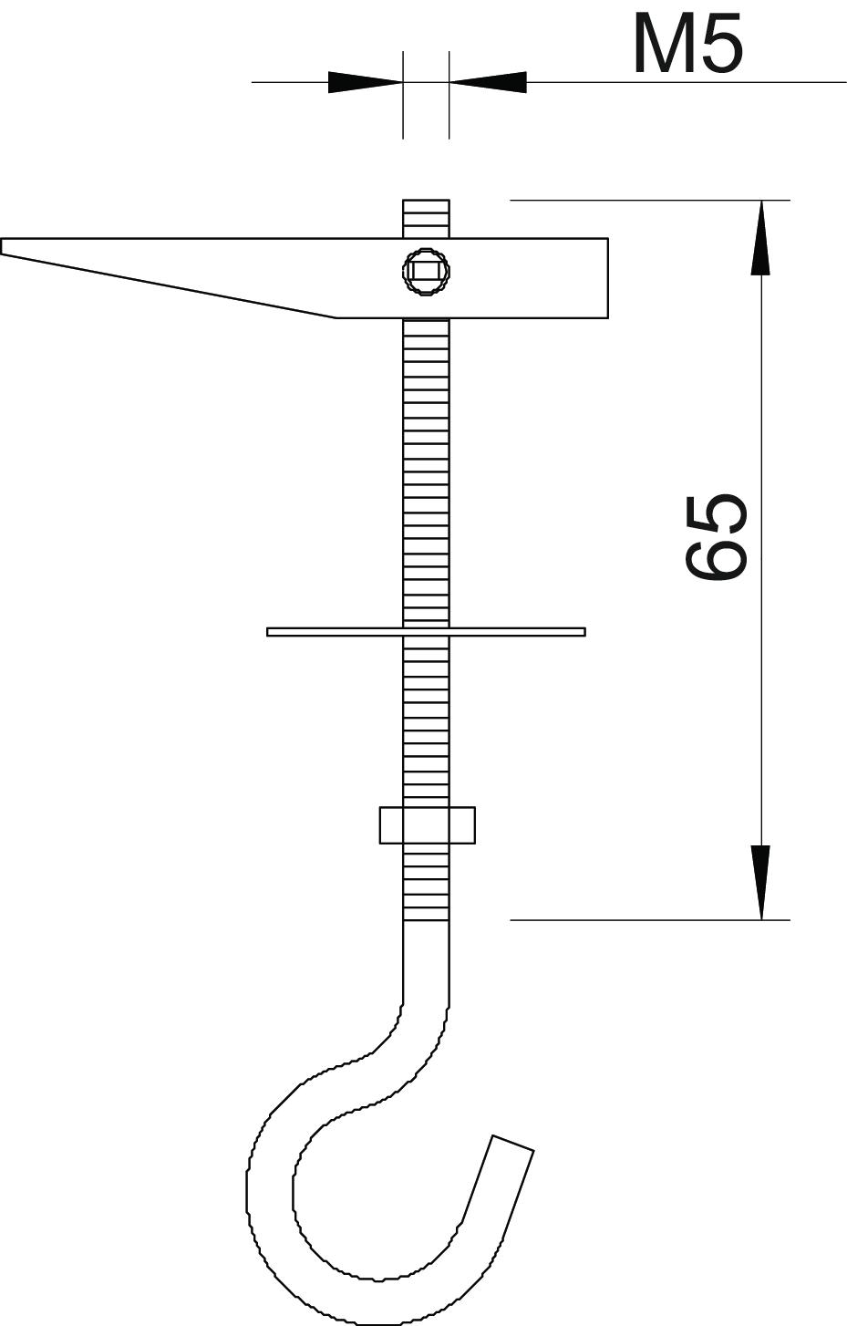 Breaking load 0,4 kN CO2 Footprint (GWP) Cradle-to-Gate 0,094 kg CO2e / 1 Piece Dimension M5x65mm Dimension L 65 mm Drill hole 13 mm Drill hole diameter, min. 13 mm hook diameter 16 mm Length 65 mm Material Steel Surface Electrogalvanized Thread M5 Thread type Metric Version for With ceiling hook With washer yes - All types
