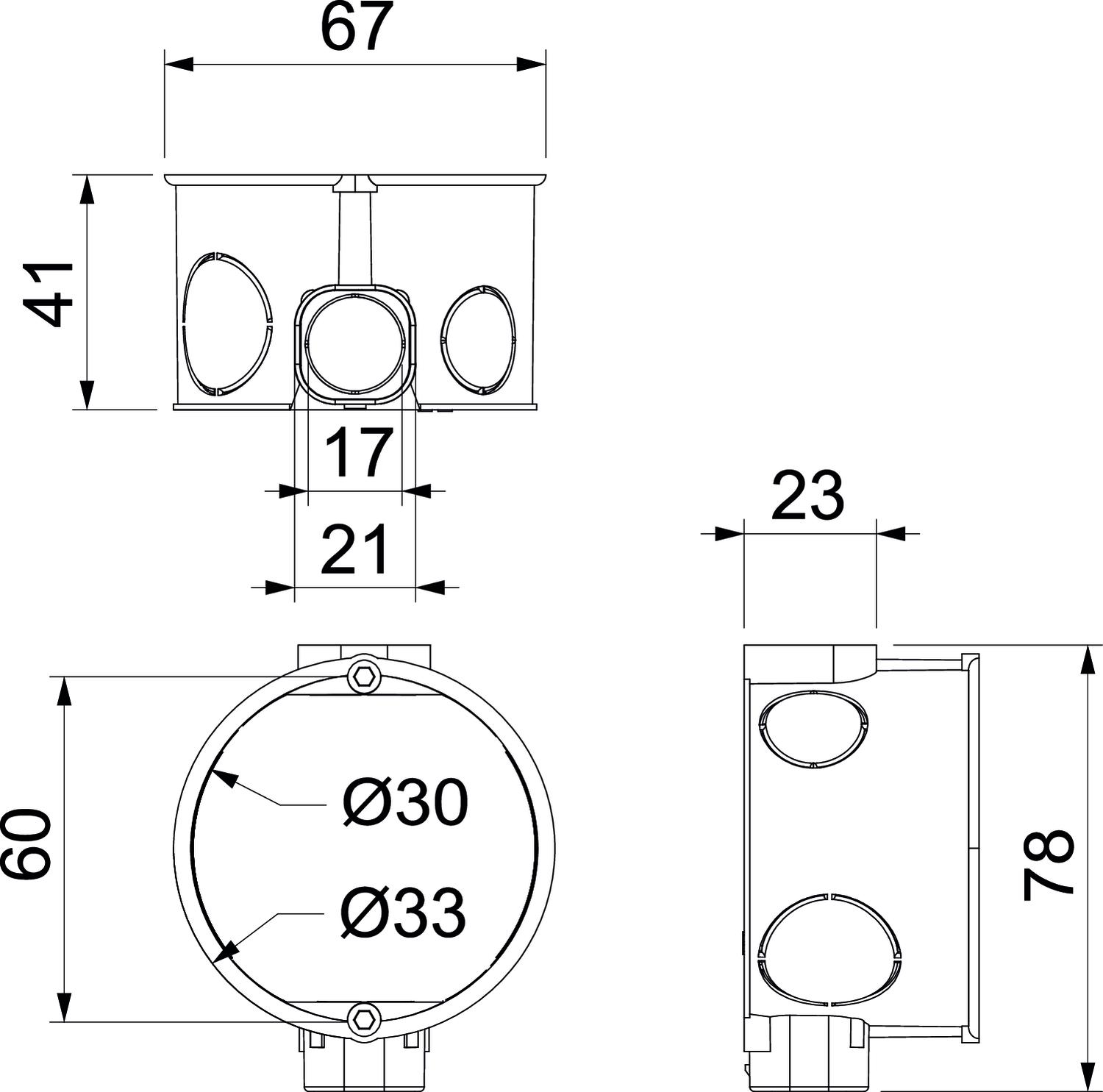 Accessory screw clearance 60 mm CO2 Footprint (GWP) Cradle-to-Gate 0,0416 kg CO₂e / 1 Piece Colour Black Cover Without Device fixing Screw or spread Dimension Ø60mm, H40mm Equipment Without Flame-resistant acc. to VDE 0471/DIN 695 Part 2-1, test temperature 650°C Floor height, min. 42 mm for pipe diameter 20/25 mm Height 40 mm Material Polystyrene No. of entries 7 Nominal cross-section, max. 2,5 mm² Nominal cross-section, min. 1,5 mm² Protection rating IP20 Rated voltage 400 V Sealable no Shape Round Support Square support Type of entry Break-out openings for cables and pipes Ø 20 mm and Ø 25 mm With bolts no - All types