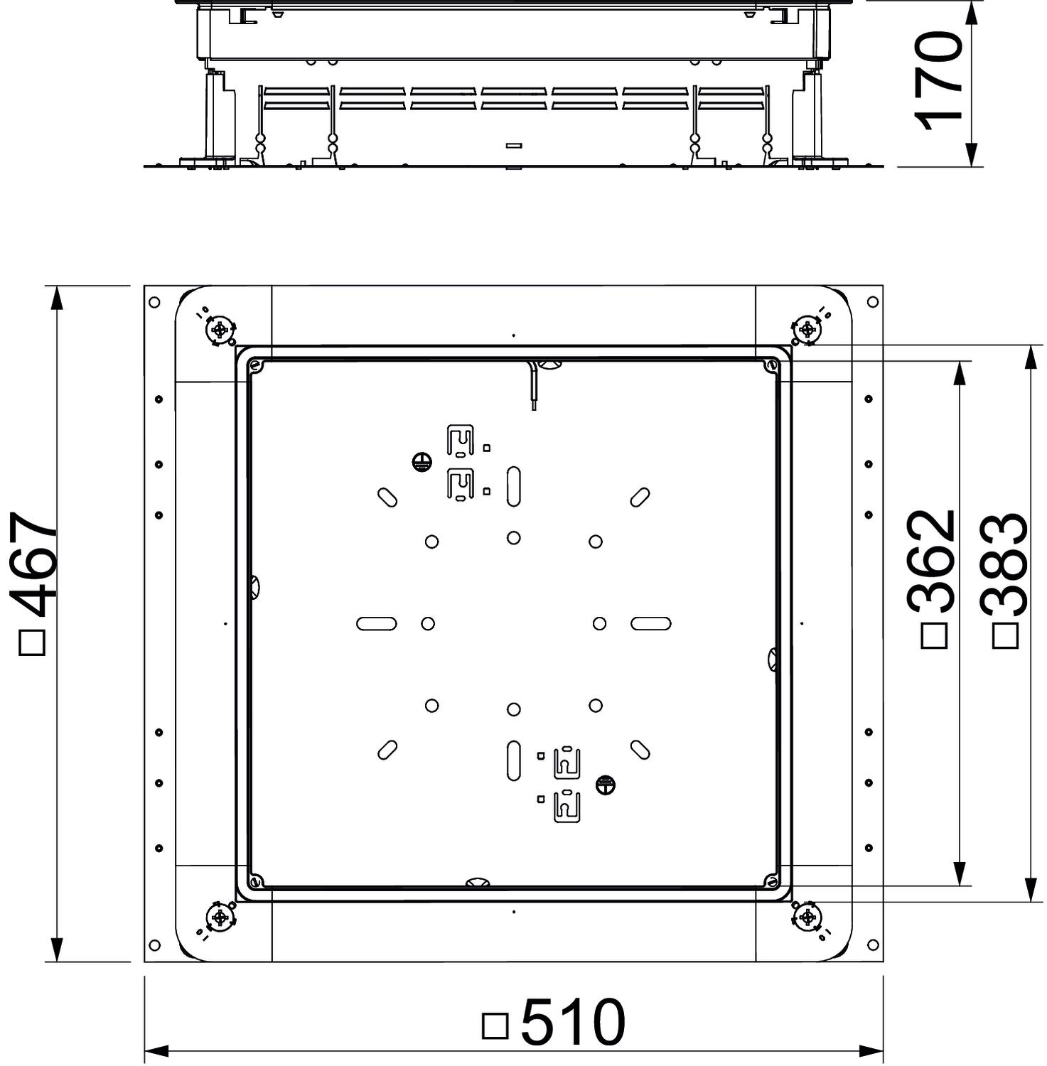 CO2 Footprint (GWP) Cradle-to-Gate 11,8771 kg CO₂e / 1 Piece Cover version Universal Decouplable yes Dimension 510x467x115 Dimension a 362 mm Dimension A 467 mm Dimension B 510 mm Dimension b 383 mm Duct height, min. 28 mm Floor plate yes For pipe connection no Height-adjustment range, max. 170 mm Height-adjustment range, min. 115 mm Installation opening for on-floor tank no Material Steel Minimum screed height 115 Nominal size 350 mm Screed height, max. 170 mm Screed height, min. 115 mm Seal installation option yes Suitable for screed-covered underfloor ducts yes Suitable for screed-flush closed underfloor ducts no Surface Strip galvanized Trunking height, max. 48 mm Trunking width, max. 350 mm Trunking width, min. 190 mm - All types