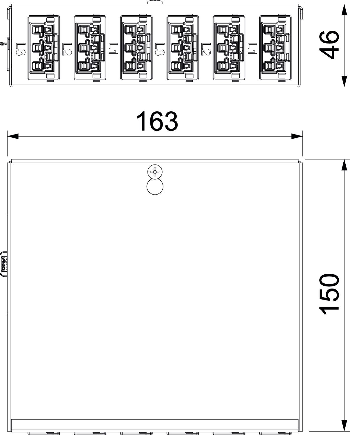Выход: 6 самоблокирующихся соединителей, 3-полюсные, черного цвета, 25 A, тип WINSTA® MIDI (гнездовая часть: 2 x L1, 2 x L2, 2 x L3).