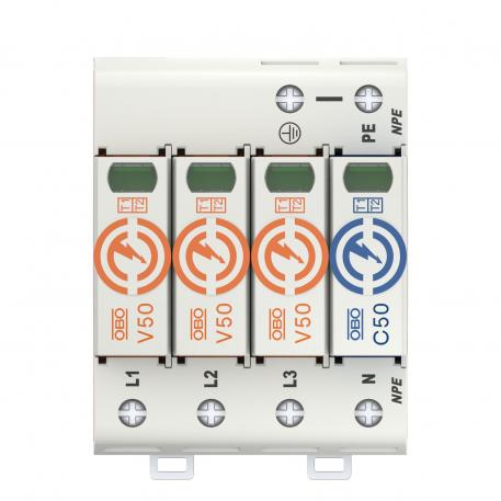 • токоотводящая способность 12,5 кА (10/350) на каждый полюс и до 50 кА (10/350) в целом;