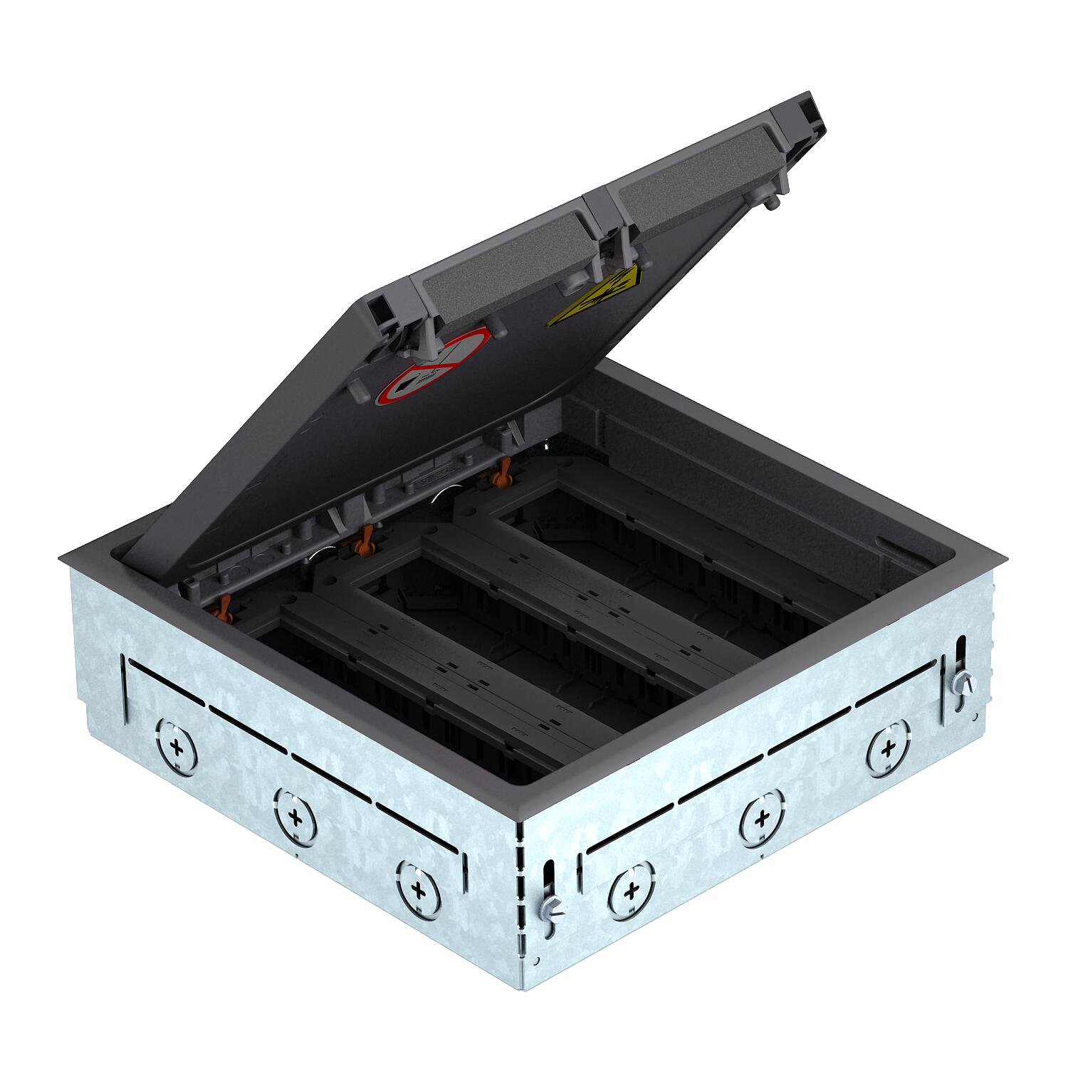 Описание продуктаКвадратная розетка для бесшовного пола с лючком GES9 для применения в бесшовных полах во внутренних помещениях. С отверстиями для ввода кабеля (M25) со всех четырех сторон.