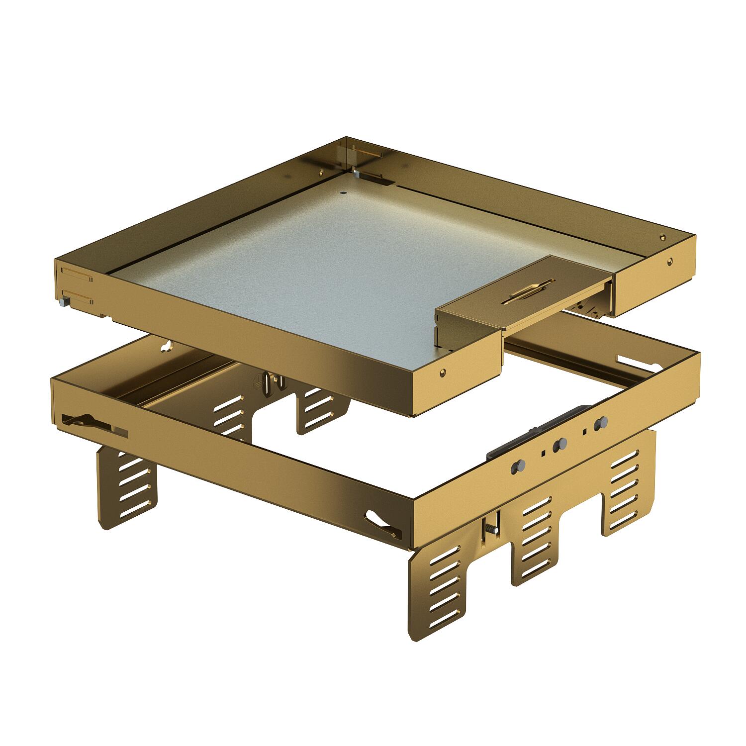 Height-adjustable cassette, decoupled from the floor, of nominal size 9, with cord outlet, for the installation of accessories in dry- or wet-cleanded floors indoors, for mounting in underfloor boxes UZD250 or UZD350, in connection with a mounting lid DUG../9. Mounting takes place using height-adjustment brackets (order separately) in the aluminium frame profile of the underfloor boxes.