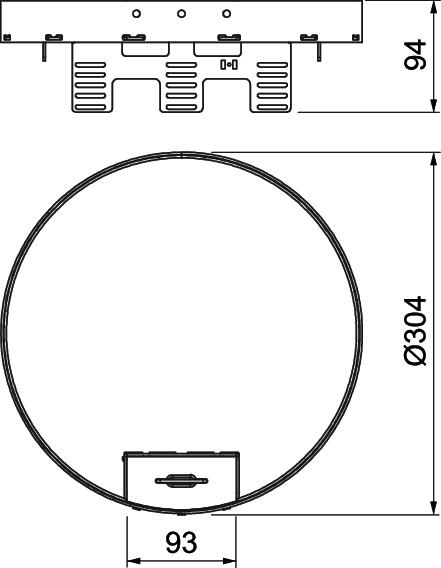 Height-adjustable cassette, decoupled from the floor, of nominal size R9 with cord outlet, for the installation of accessories in dry- or wet-cleanded floors in indoor areas, for mounting in underfloor box UZD350-3 in connection with a mounting lid DUG350-3R9. Mounting is done with height-adjustment brackets (order separately) in the aluminium frame profile of the underfloor boxes.