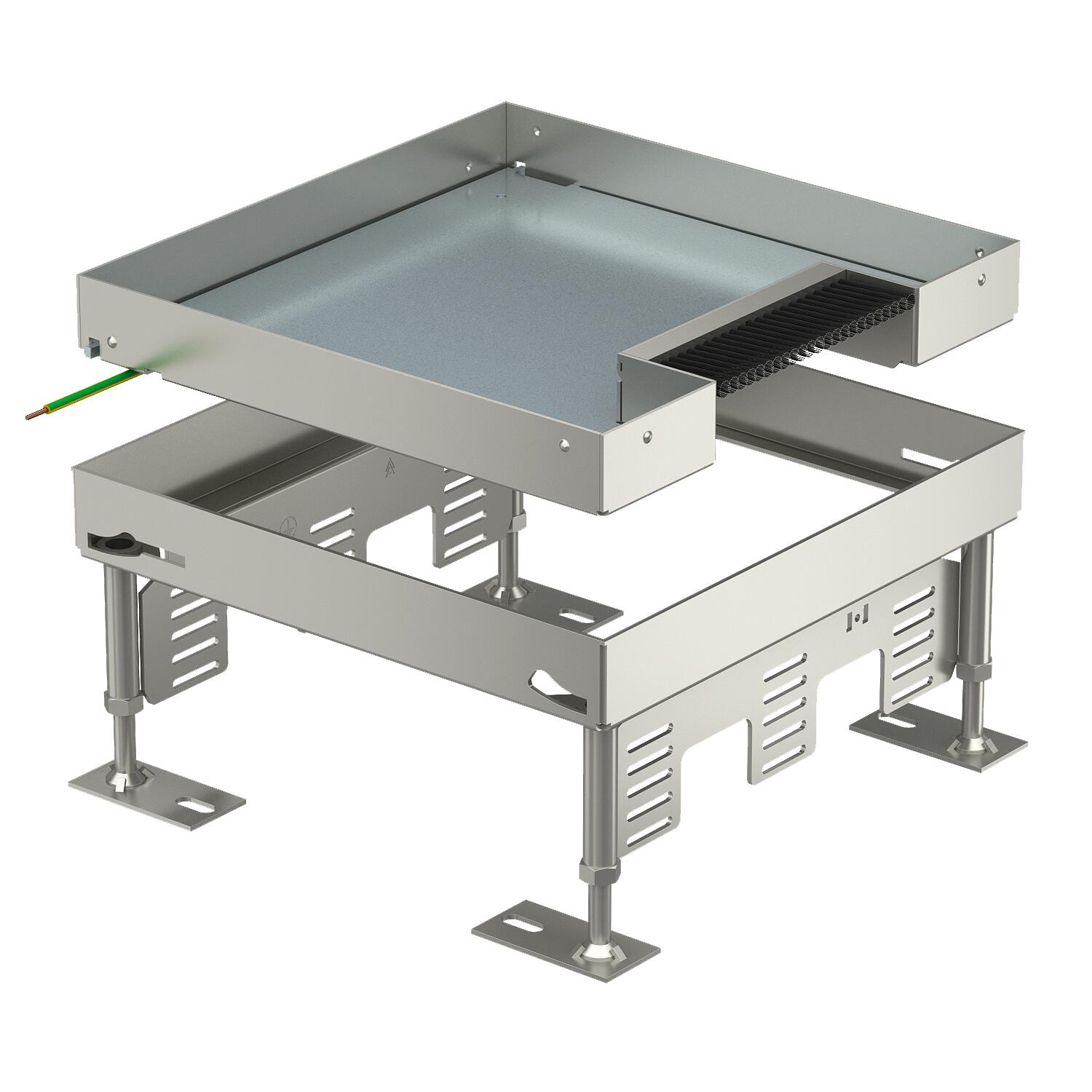 Описание продуктаРегулируемая по высоте кассетная рамка номинального размера 9 с кабельным выводом, для монтажа электроустановочных изделий в полах с сухим типом уборки.