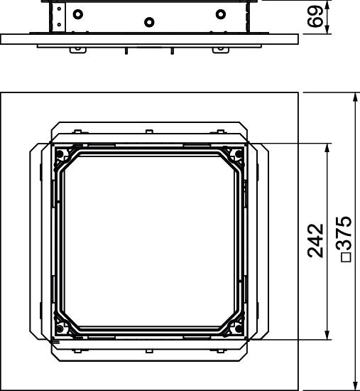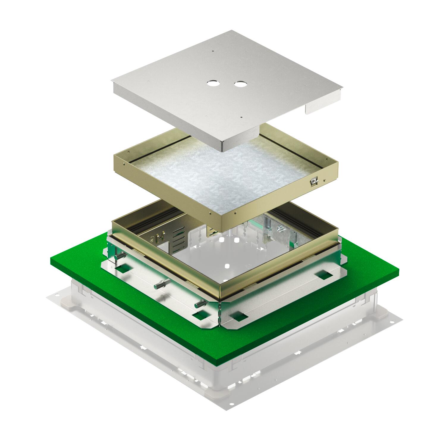Height-adjustable cassette with blanking cover. The scope of delivery contains an aluminium screed protection cover (grindable), a suitable mounting lid to fix the cassette lined body and an ISO apron for decoupling from the underfloor connection socket.