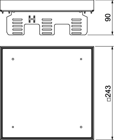Height-adjustable cassette, decoupled from the floor, blank, of nominal size 9, to create an inspection opening in dry- or wet-cleaned floors in indoor ares, for mounting in underfloor boxes UZD250 or UZD350, in connection with a mounting cover DUG../9. Mounting takes place using height-adjustment brackets (order separately) in the aluminium frame profile of the underfloor boxes. Only suitable for smooth floor coverings.