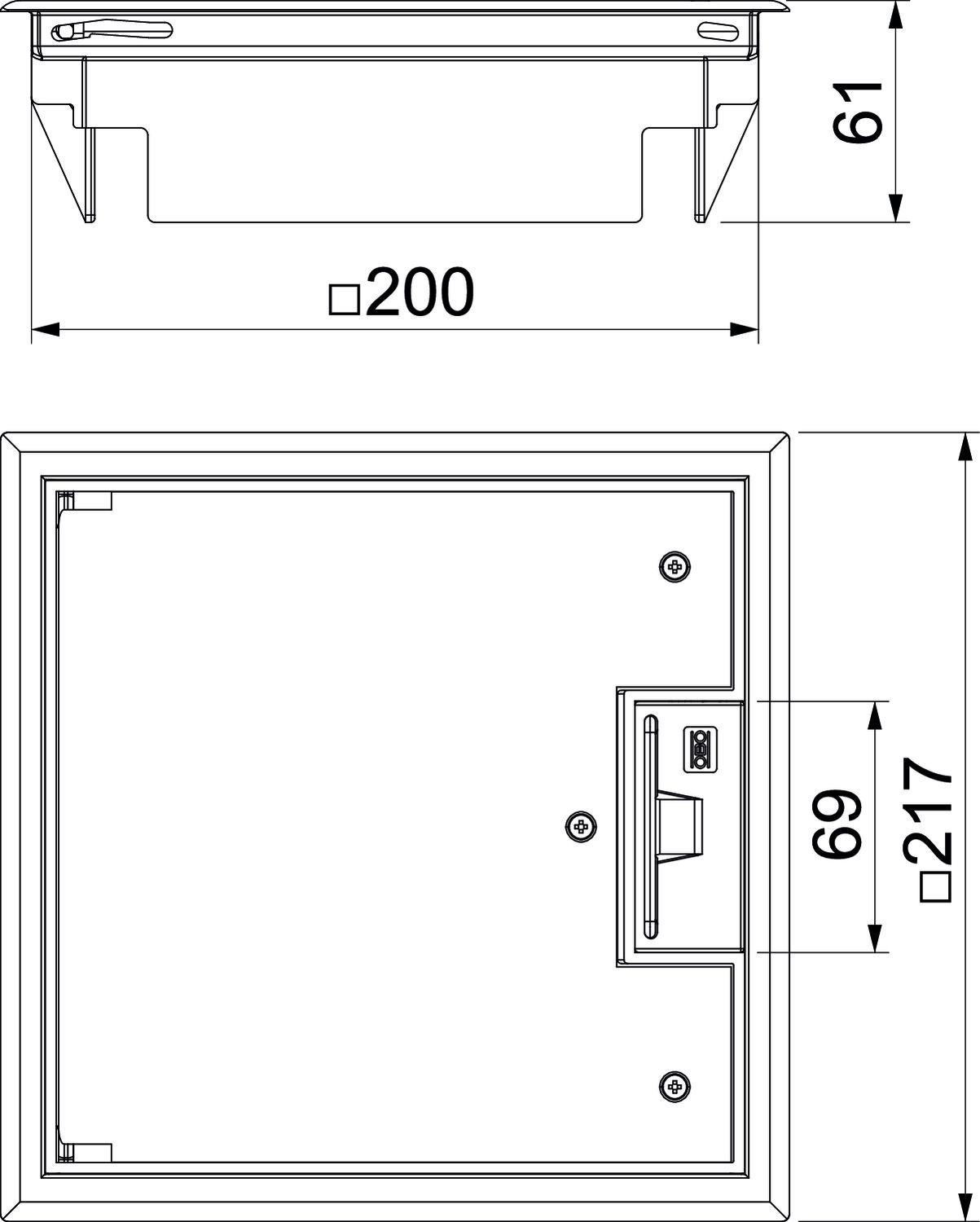 Электромонтажный лючок GES2, с ручкой, 1-секционный, для установки монтажной коробки MT4. Могут быть установлены 2 накладки APMT2.