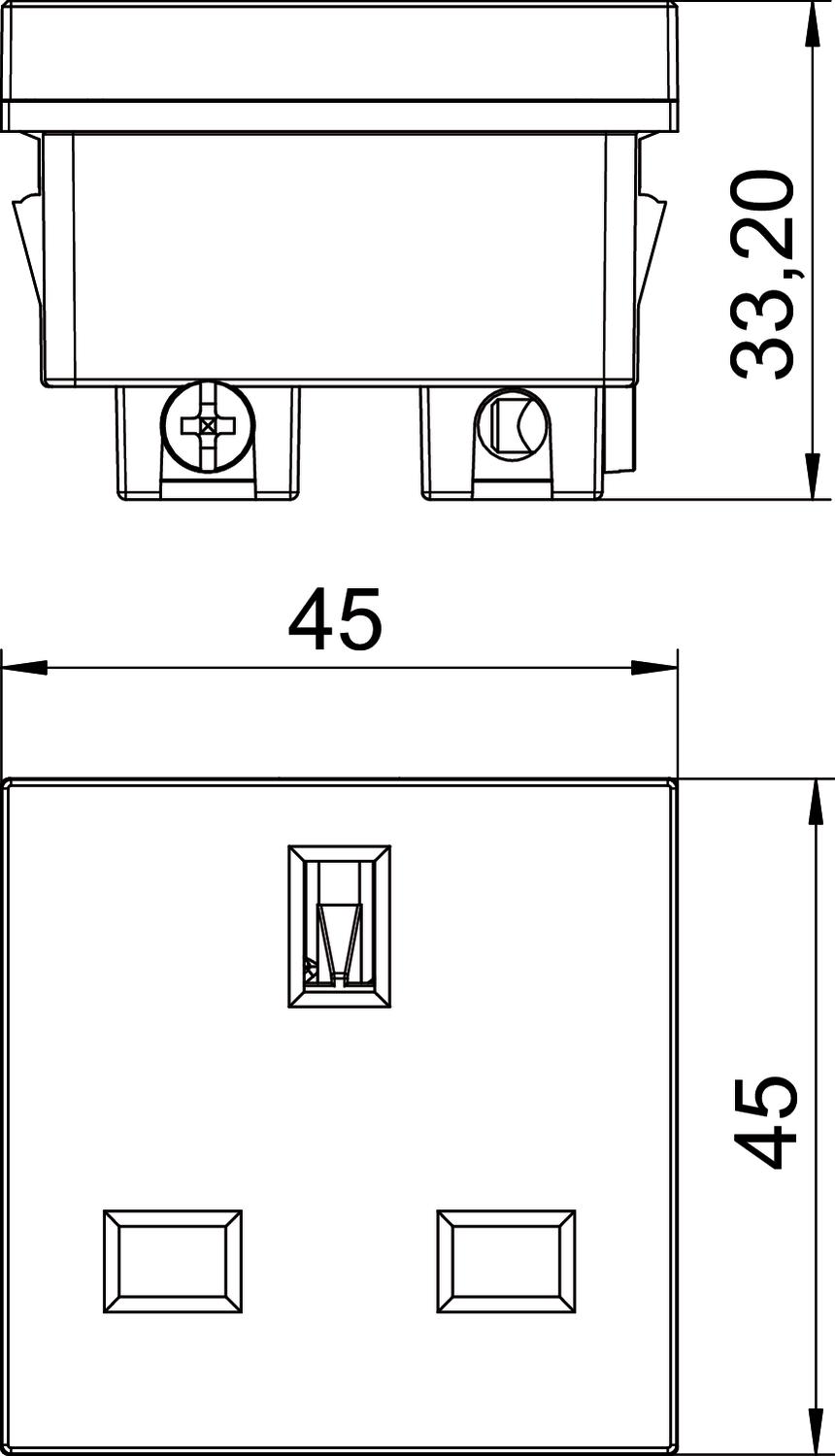 Описание продуктаОдинарная розетка 0°, британский стандарт, соответствует стандарту BS 1363, с усиленной защитой от касания, с винтовыми зажимами, 2-полюсная, 13 А, 250 В~.