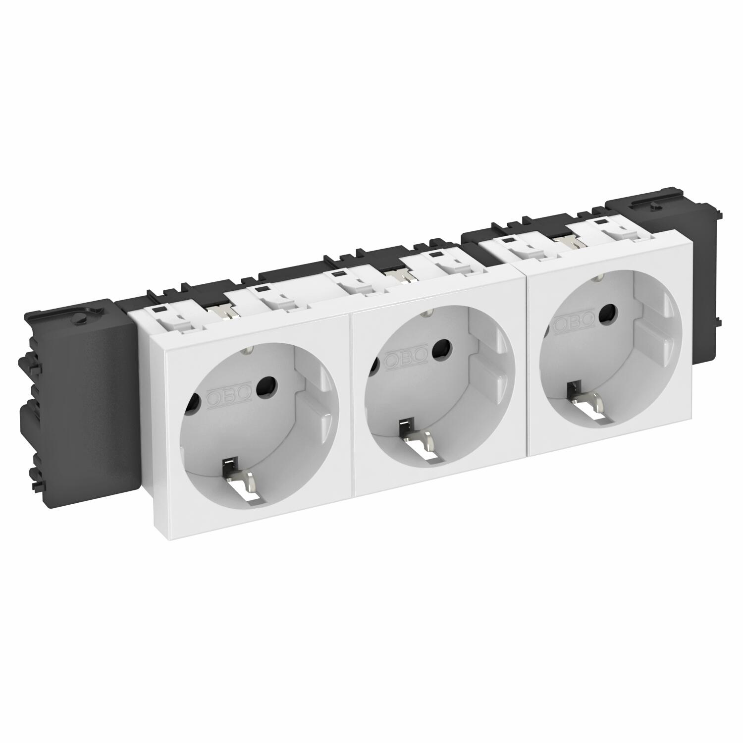 Описание продуктаРозетка с заземляющим контактом, тройная 0°, с боковым подключением, с защитными шторками, с автоматическими клеммами, 2-полюсная, 16 A, 250 V~, соединительные клеммы соответствуют стандарту IEC 60884-1, подходит для установки в кабельные короба Rapid 45.