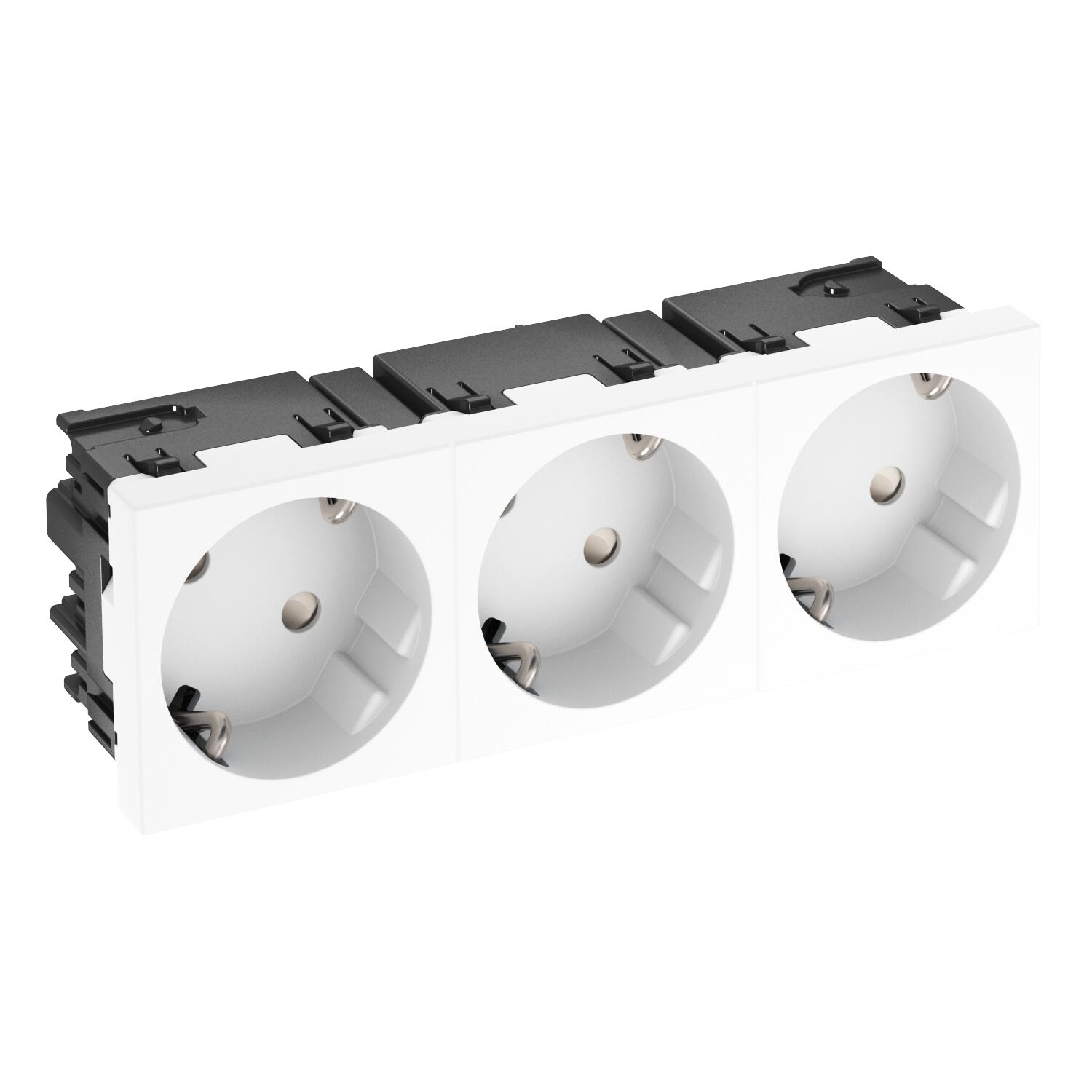 Описание продуктаРозетка с заземляющим контактом тройная 33°, с повышенной защитой от прикосновений, со вставными клеммами, 2-полюсная, 16 A, 250 V~, с соединительными зажимами согласно IEC 60884-1.