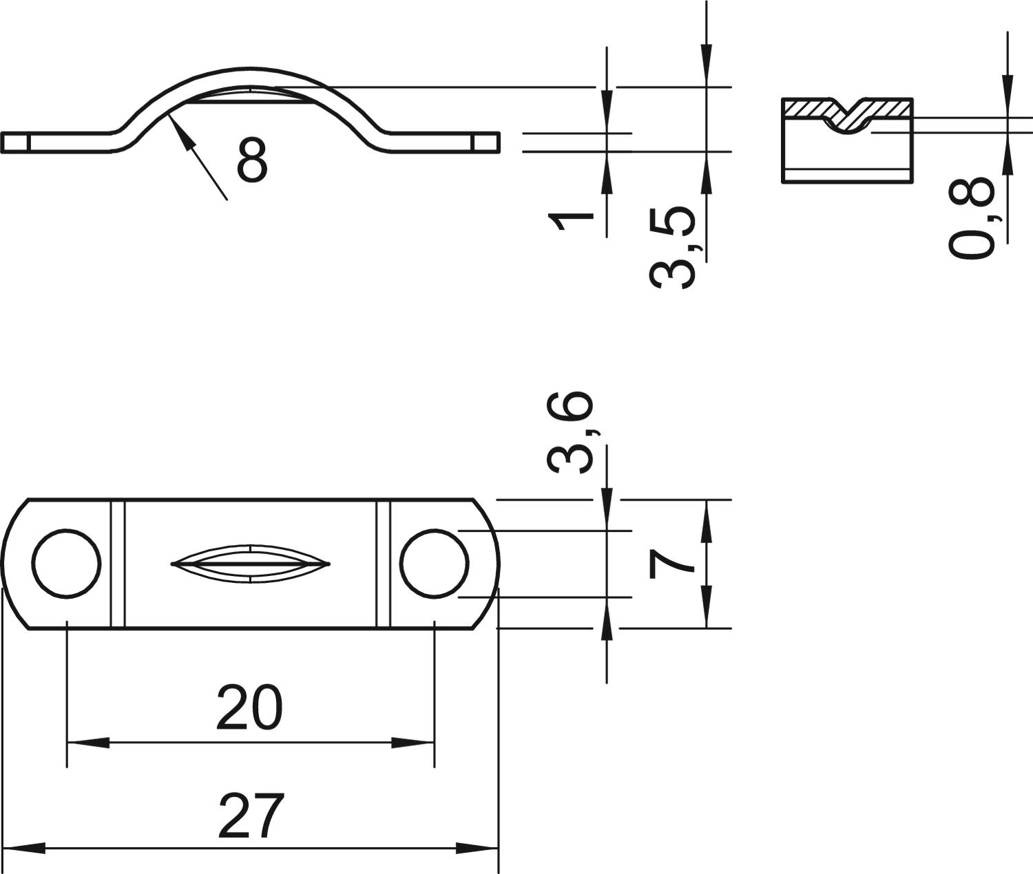 В пластмассовой оболочке нет Вид крепления отверстие под винт Высота 3,5 mm Диапазон зажима D макс. 8 mm Диапазон зажима D мин. 8 mm Длина 27 mm для диаметра 8 Исполнение С двумя лапками Количество кабелей/труб 1 Материал Сталь Не содержит галогенов да Номинальный диаметр 8 mm Поверхность гальванически оцинкованный Подходит для зоны противопожарной безопасности нет Прочность материала 0,8 mm Размер II Размер 8mm Размер b 7 mm Размер h 3,5 mm Размер I 20 mm Размер Н1 (мм) 0,8 Размер отверстий 3,6 Размер d 3,6 mm Размер L 27 mm Размер R 8 mm Размер t 1 mm Расстояние до стены нет Углеродный след CO2 (GWP) от колыбели до ворот 0,0054 кг CO2e / 1 Шт. Устойчив к УФ да Ширина 7 mm - Все виды