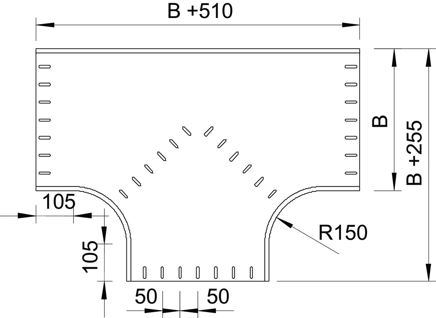 Фасонная деталь круглого исполнения. Внутренний радиус фасонной детали составляет 150 мм. Все боковые стороны предназначены для кабельных лотков одинаковой ширины.